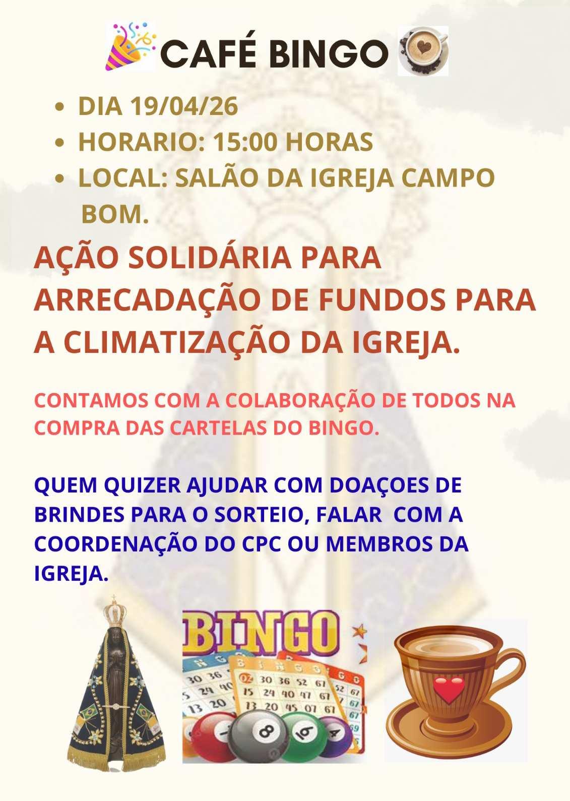 AComissão do CPC da Igreja Igreja Nossa Senhora Aparecida está mobilizando a comunidade para uma importante ação solidária. O objetivo é arrecadar recursos destinados à climatização do templo e a outras melhorias estruturais que visam oferecer mais conforto aos fiéis e frequentadores. Entre as iniciativas programadas, destaca-se a realização de um Café Bingo beneficente, evento que une lazer, integração comunitária e solidariedade. A proposta é reunir moradores de Campo Bom, bairros vizinhos e de todo o município de Jaguaruna em um momento de convivência e apoio coletivo à causa. Durante o evento, os