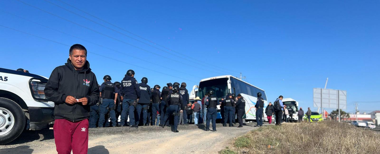 por elementos de la policía estatal, quienes pretendían impedir que estos llegaran al centro de Pachuca. Por lo anterior, los inconformes decidieron bajar de la autobuses y comenzaron a caminar sobre la carretera, aseguraron que las patrullas no iban a impedir que llegaran hasta Palacio de Gobierno para externar al gobernador las inconformidades que tenían y lamentaron el actuar de la policía ya que esto provocó que avanzaran a pie durante varios kilómetros expuestos al calor y los rayos del sol. Previo a que el contingente avanzara a pie, al lugar
