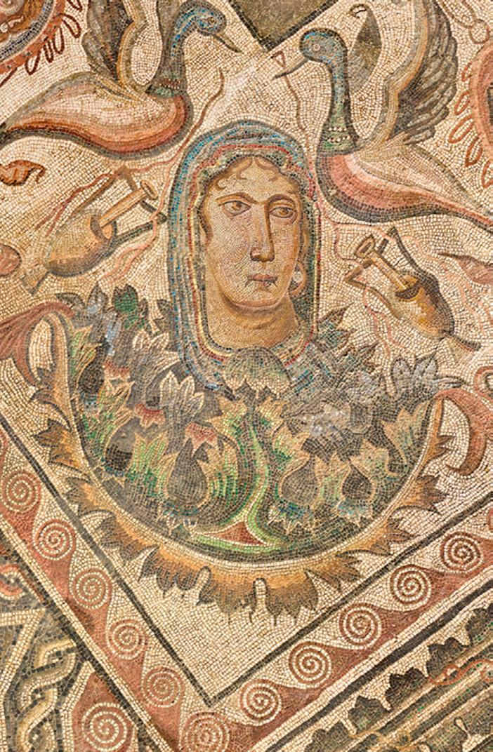 Sus pequeñas teselas se organizan en una armoniosa escena donde se narra el episodio de Aquiles descubierto por Ulises en Skyros. La escena se enmarca en una cenefa que muestra retratos, quizá de los dueños, flanqueados por ánades y delfines, símbolos heráldicos de poder y nobleza. Bajo esta imagen principal, una vibrante escena de caza revela a cazadores armados a pie y a caballo, rodeados por animales autóctonos y exóticos, con un realismo impresionante.