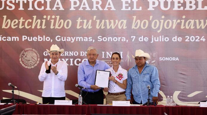 En el evento, la presidenta electa firmó junto a López Obrador un decreto para restituir 12 mil 978 hectáreas al territorio indígena Yaqui para sumar 45 mil hectáreas restituidas por el Estado.