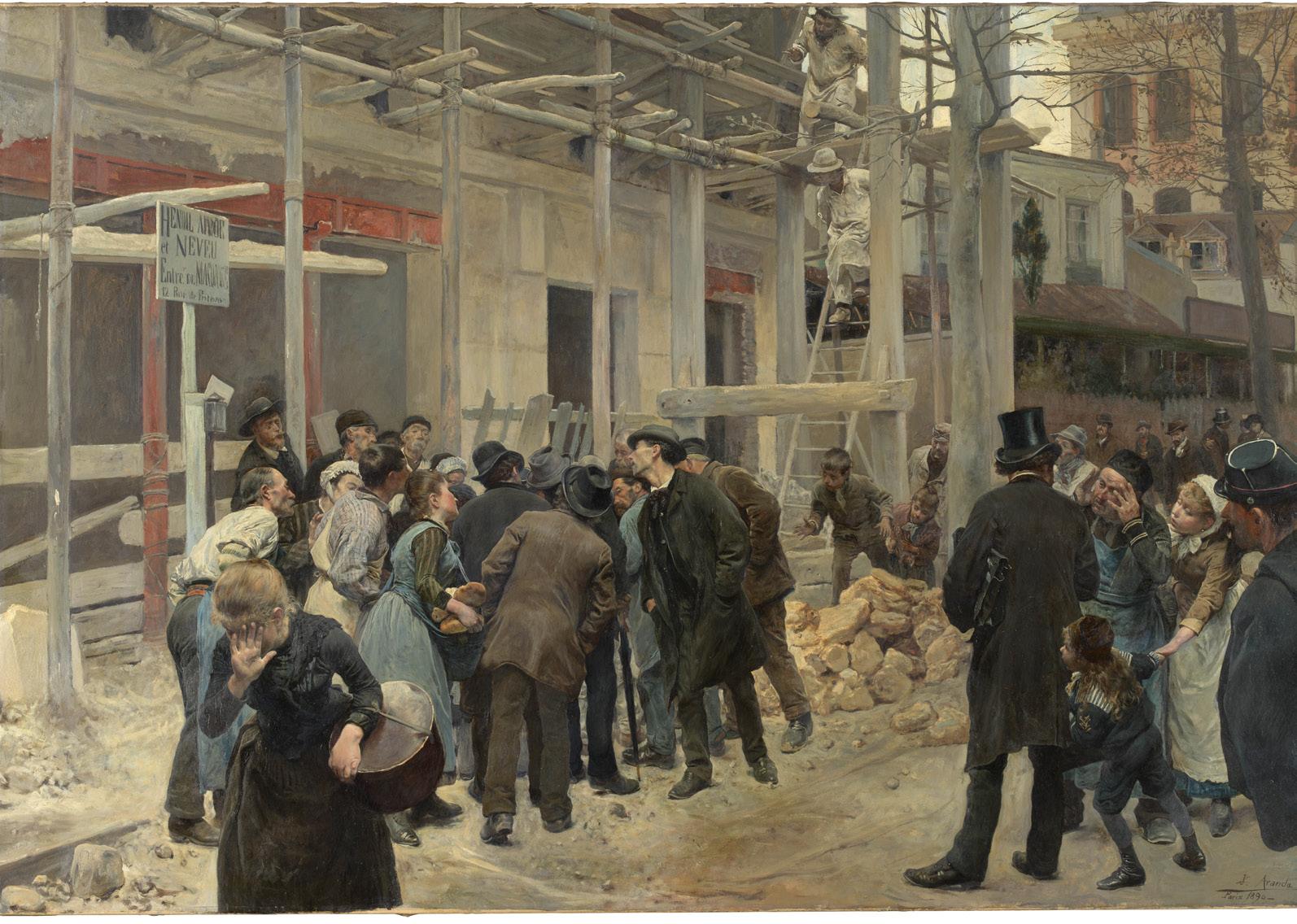 La insuficiente protección de los trabajadores hacía frecuentes los accidentes laborales en las tareas tradicionales, como la pesca, en ¡Aún dicen que el pescado es caro!, de Joaquín Sorolla, y también en los nuevos trabajos de obras públicas motivados por la expansión de la construcción, que vemos en Una desgracia, de José Jiménez Aranda.