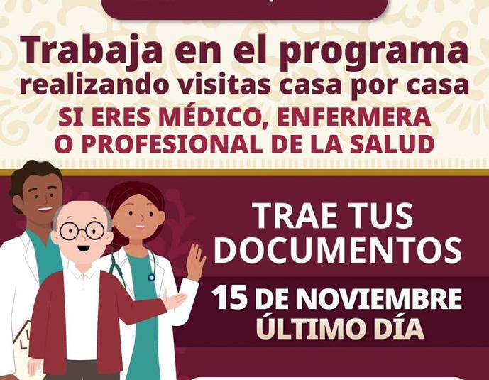 De acuerdo con la convocatoria nacional, hoy es el último día para el registro de los profesionales de la salud interesados en formar parte del programa “Salud Casa por Casa”, de la Secretaría del Bienestar. Las médicas, médicos, enfermeras, enfermeros y profesionales de la salud, darán seguimiento a la salud de los Adultos Mayores y Personas con Discapacidad con visitas en sus domicilios