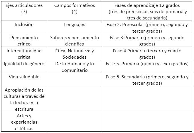 fases de aprendizaje, campos formativos y ejes articuladores. Todo un nuevo lenguaje que el interesado en estos temas puede ver organizado en la siguiente figura.