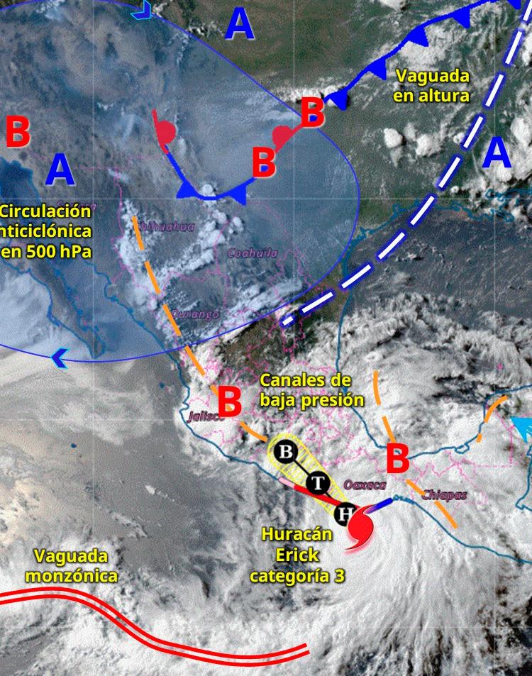De acuerdo con el Servicio Meteorológico Nacional (SMN), Erick se desplaza hacia el noroeste a 15 kilómetros por hora, con vientos máximos sostenidos de 155 y rachas de hasta 195.