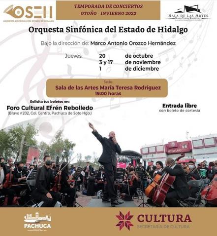 Como parte de la misma temporada, los próximos miér coles, 26 de octubre y el ocho de no viembre; así como el viernes 25 del mis mo mes, la OSEH brindará presentaciones en el Teatro Hidalgo Bartolomé de Medi na. Los boletos son también de cortesía y se pueden conseguir en el mismo lugar y con idénticos horarios. En nuestro estado, ¡primero la cultura!