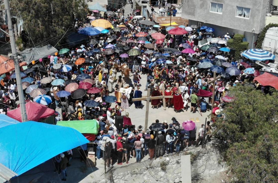 El sonido de enjambre hizo que de un momento a otro la gente volteara al cielo para mirar a un nuevo espectador. Un dron que desde el aire presenciaba la representación del viacrucis se había hecho presente y captaba con su cámara, de alta definición, los momentos más emblemáticos de la actividad religiosa.