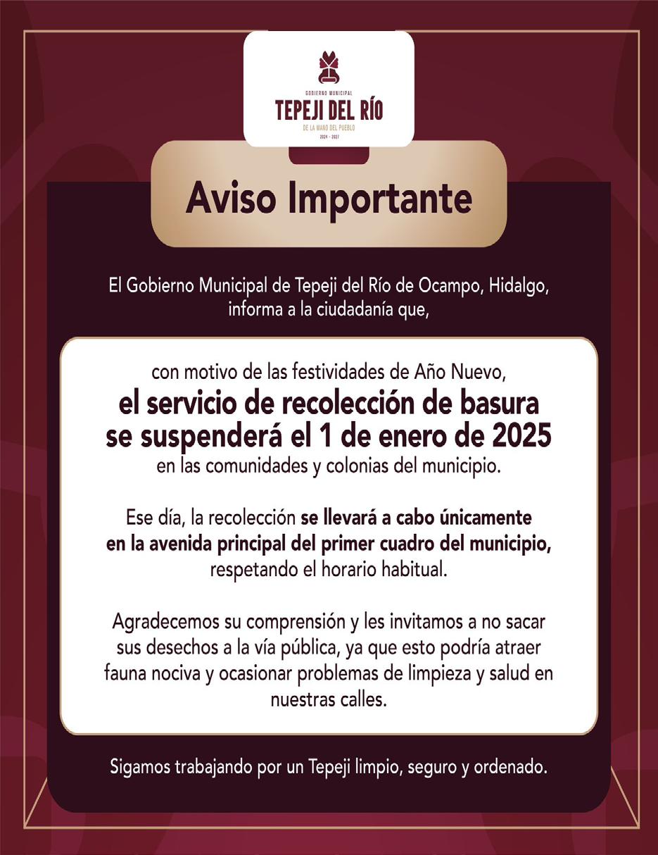 • Oscar Raúl Pérez Cabrera JEFE DE INFORMACIÓN • Ángel Martín Trigueros González COORDINADOR DE EDICIÓN • Luis Antonio Monroy COORDINADOR DE DEPORTES • Ana Luisa Vega Hernández COORDINADORA DE MUNICIPIOS • Rubén Mendoza Bermúdez COORDINADOR DE BARANDILLA • Tania Peralta Zamora • COORDINADORA DE SHOW Y CULTURA • Vianey Tolentino Sánchez COORDINADORA DE DISEÑO • Néstor Ramírez Castro JEFE DE PRODUCCIÓN • PLAZA JUÁREZ. “La Historia de Cada Día”, publicación diaria 31 de diciembre de 2024 Año 19 • Número 7071 • Editor Responsable Sr. Martín Peralta Sánchez • Número de Certificado de Reserva otorgado por el Instituto Nacional de Derecho de Autor 04-2021-110417520700-101 • Número de Certificado de Licitud de Contenido Número 11644 • Número de Certificado de Licitud de Título Número 14071. Otorgado por la comisión Calificadora de Publicaciones y Revistas Ilustradas de la Secretaría de Gobernación • Publicado y Distribuido por Comunicación Colectiva de Hidalgo S.A. de CV. *Domicilio de la Publicación: Calle Diamante 400 Fraccionamiento Colosio I. Pachuca, Hidalgo CP 42088 Teléfono 71 702 80