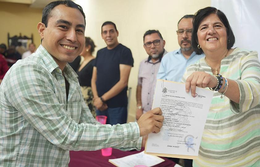 La alcaldesa, miembros del cabildo y la secretaria general del sindicato entregan nombramiento a los nuevos empleados sindicalizados: Jonathan Sánchez Hernández, Citlali Guadalupe Hernández Santos,