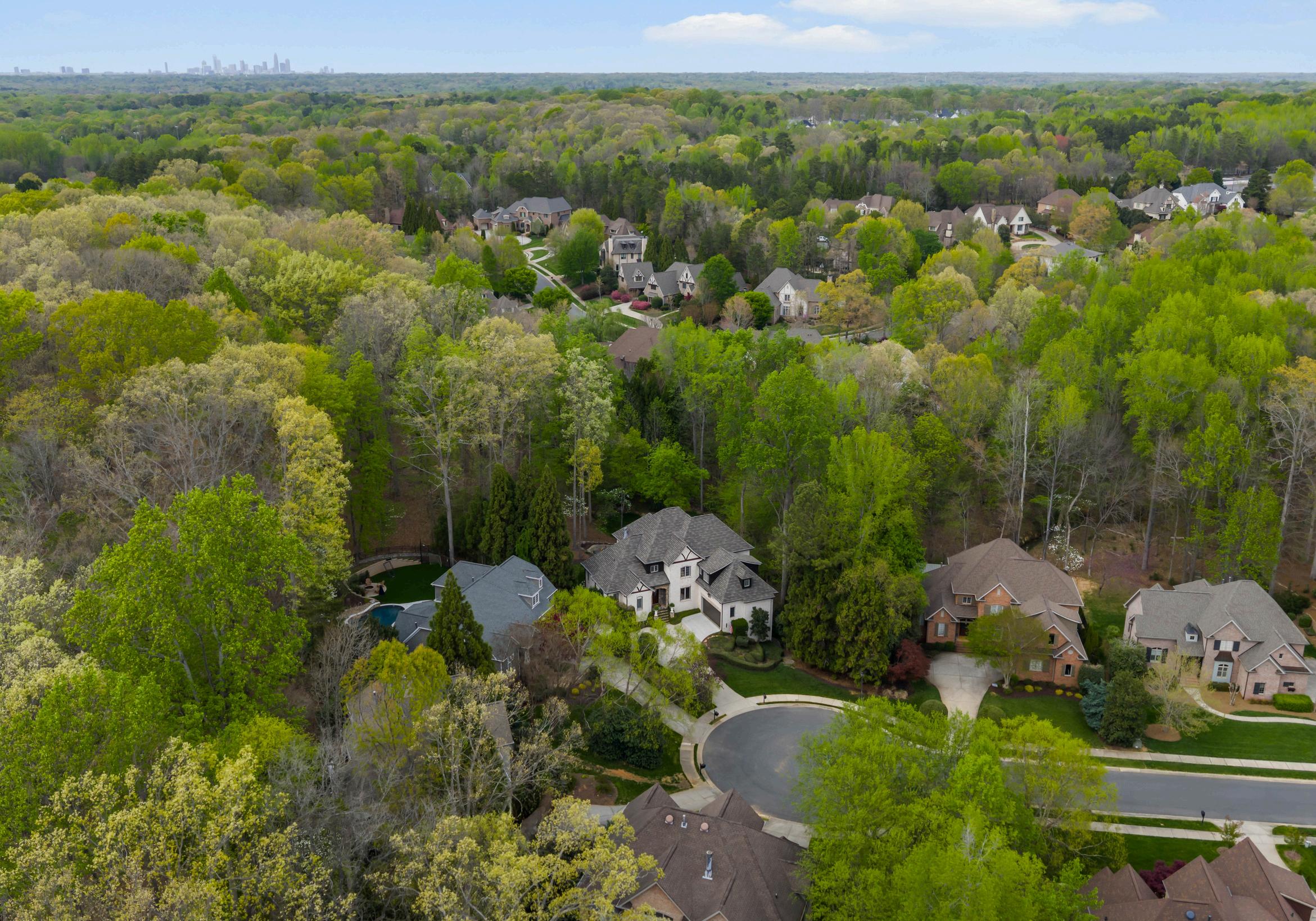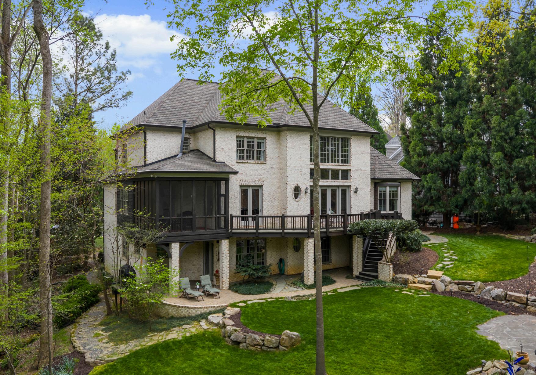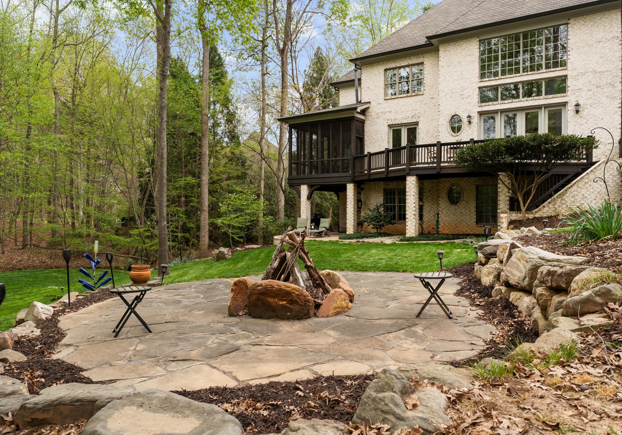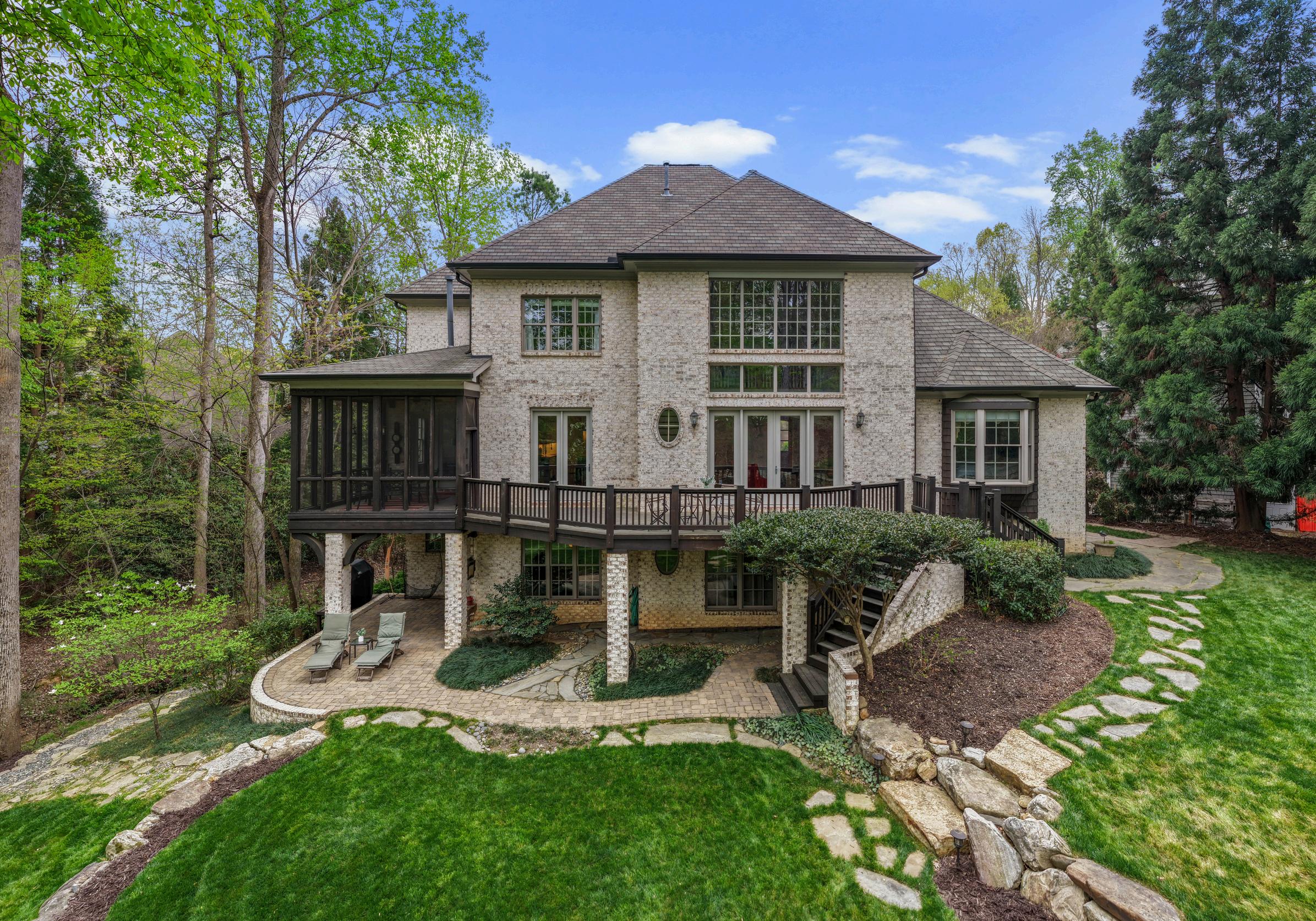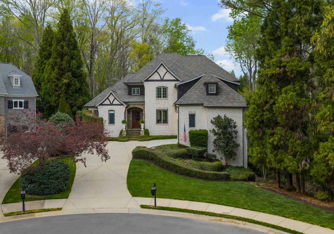 Public Rmrks: Welcome Home to your own private retreat, tucked into a serene wooded cul-de-sac setting just minutes from the conveniences of Matthews and Charlotte. This custom all-brick residence offers six bedrooms and exceptional living space designed for both everyday comfort and effortless entertaining. Set on a premium lot with abundant open space for recreation, the home blends timeless architecture with a peaceful natural backdrop. Inside, dramatic design elements make an immediate impression, including a 30-foot cedarpaneled ceiling, a dramatic tapered river stone fireplace with solid timber mantel, and a stunning two-story wall of windows that bring the outdoors into the heart of the home. In 2026, the main level was enhanced with curated designer lighting, while the chef’s kitchen was beautifully remodeled with an expansive island and handmade Moroccan Zellige tile. The kitchen flows seamlessly into the breakfast area, keeping room and screened in porch, creating an inviting space for gathering. Main floor living areas with 10' ceilings connect beautifully for entertaining while offering elevated views of the expansive backyard. The main-level primary suite provides convenience and privacy, while the second floor features three spacious bedrooms, each with