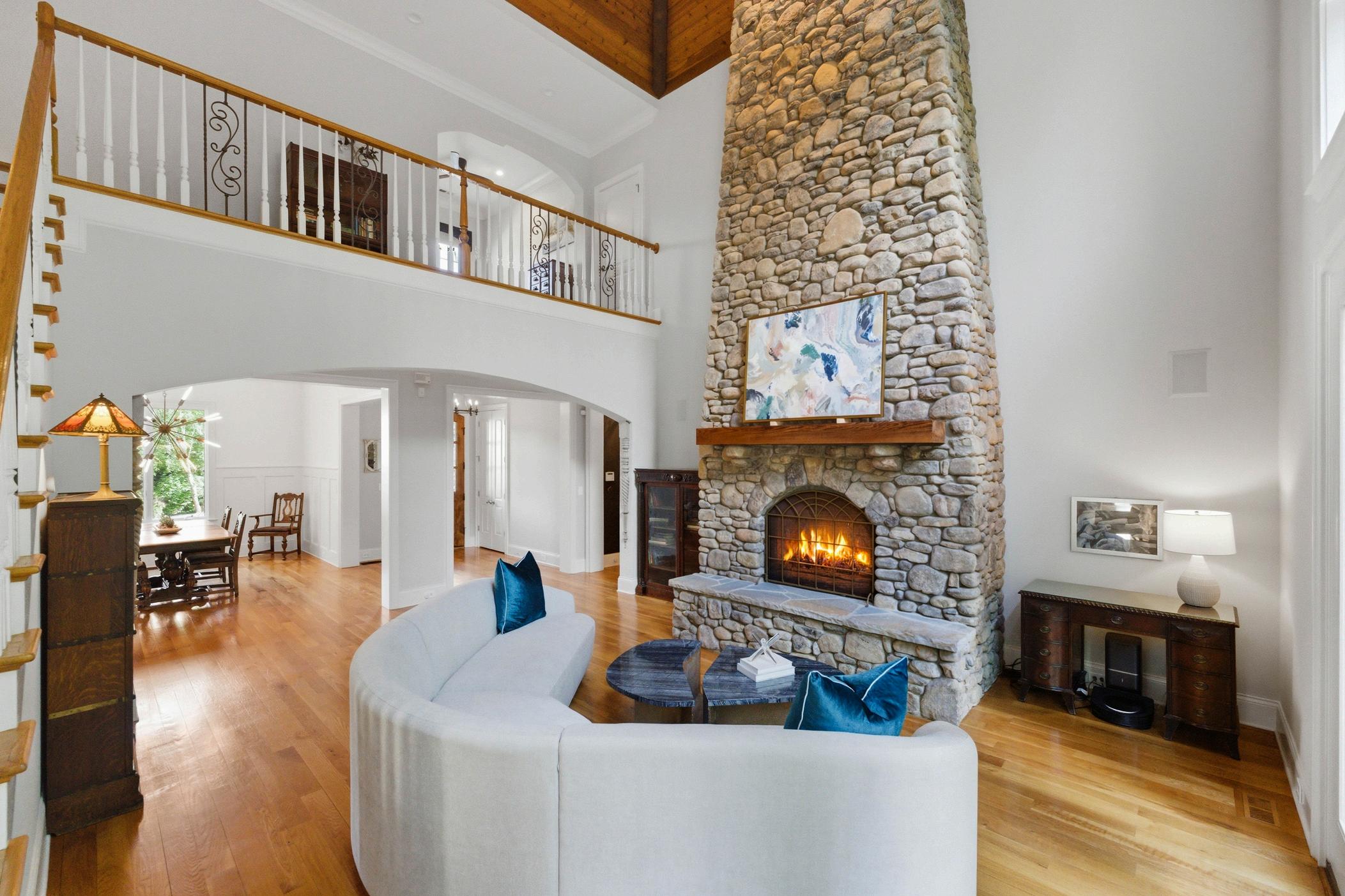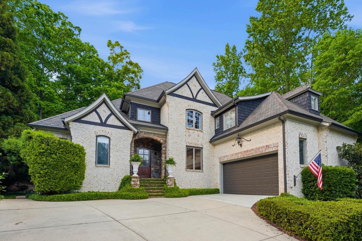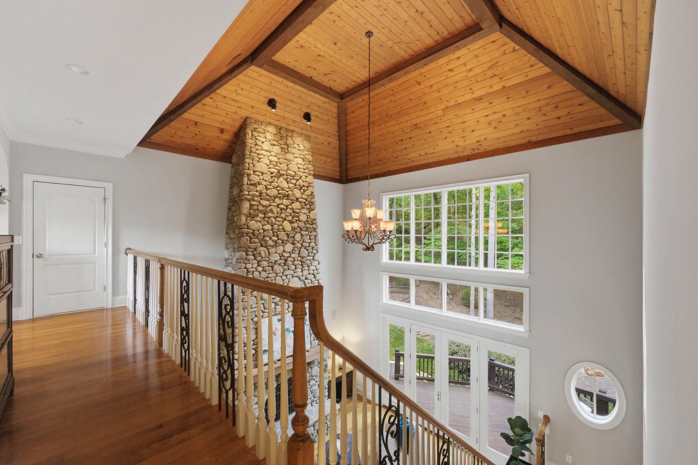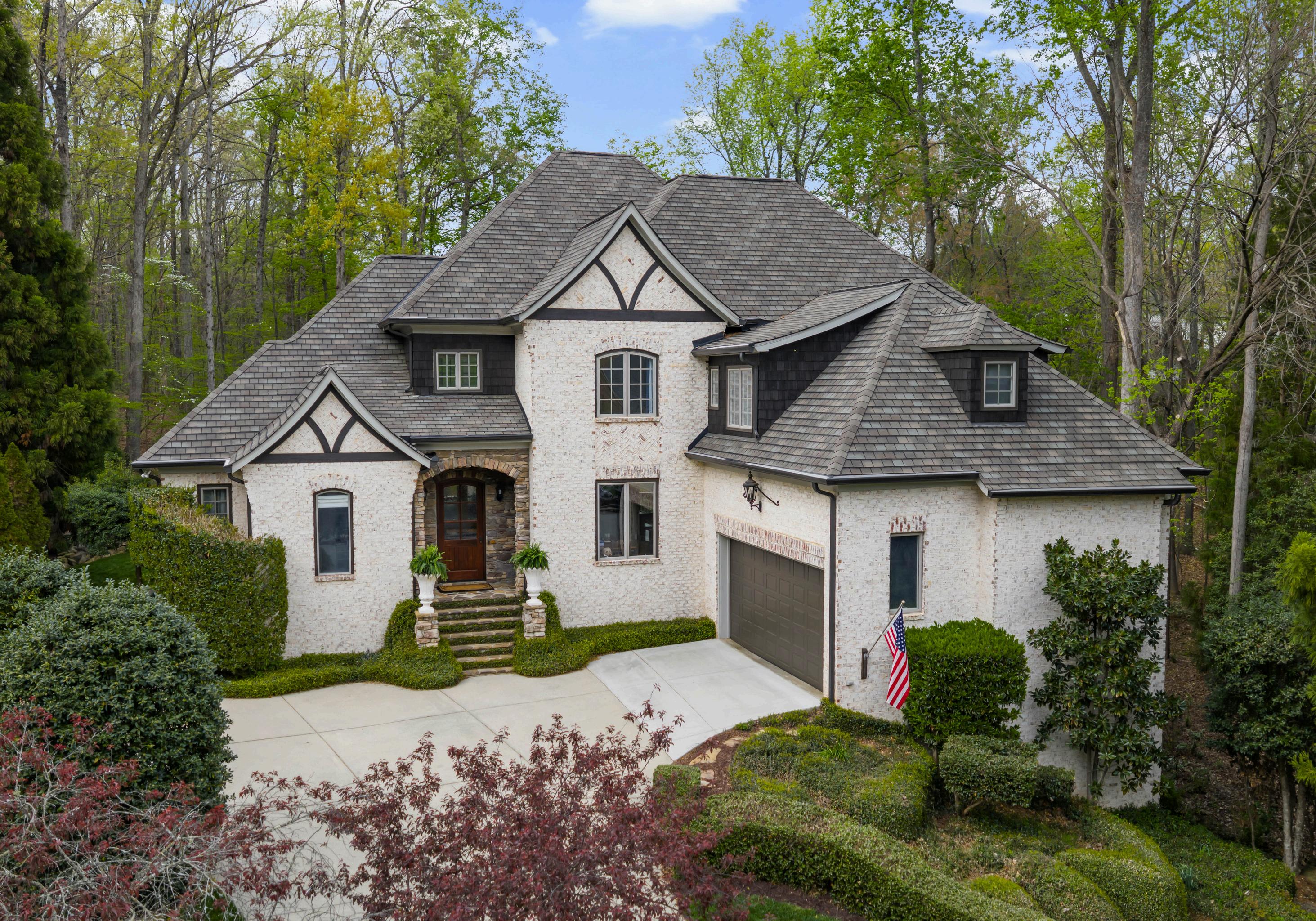 Public Rmrks: Welcome Home to your own private retreat, tucked into a serene wooded cul-de-sac setting just minutes from the conveniences of Matthews and Charlotte. This custom all-brick residence offers six bedrooms and exceptional living space designed for both everyday comfort and effortless entertaining. Set on a premium lot with abundant open space for recreation, the home blends timeless architecture with a peaceful natural backdrop. Inside, dramatic design elements make an immediate impression, including a 30-foot cedarpaneled ceiling, a dramatic tapered river stone fireplace with solid timber mantel, and a stunning two-story wall of windows that bring the outdoors into the heart of the home. In 2026, the main level was enhanced with curated designer lighting, while the chef’s kitchen was beautifully remodeled with an expansive island and handmade Moroccan Zellige tile. The kitchen flows seamlessly into the breakfast area, keeping room and screened in porch, creating an inviting space for gathering. Main floor living areas with 10' ceilings connect beautifully for entertaining while offering elevated views of the expansive backyard. The main-level primary suite provides convenience and privacy, while the second floor features three spacious bedrooms, each with