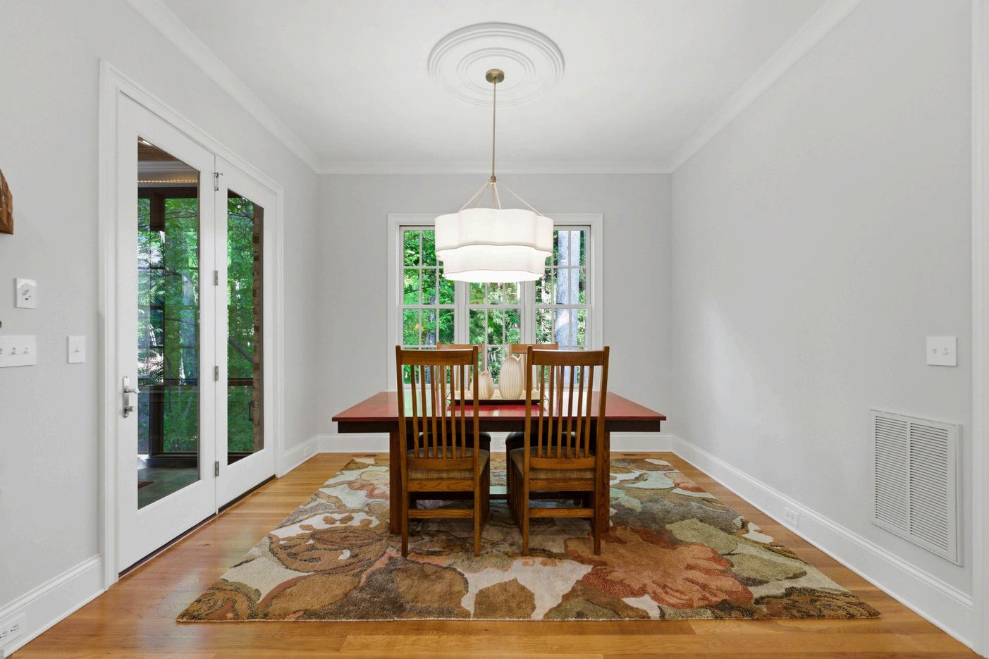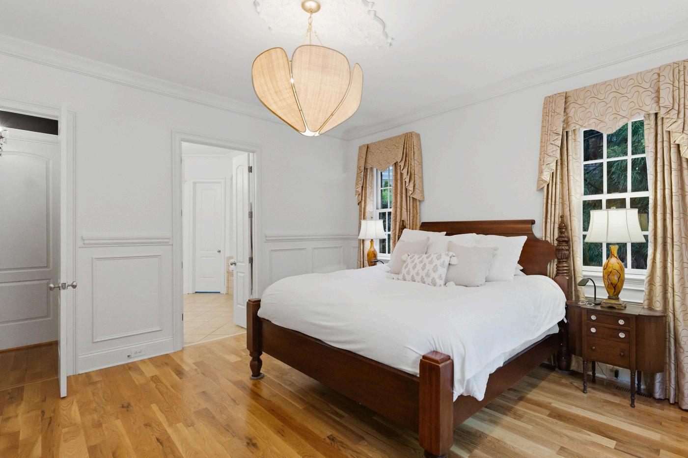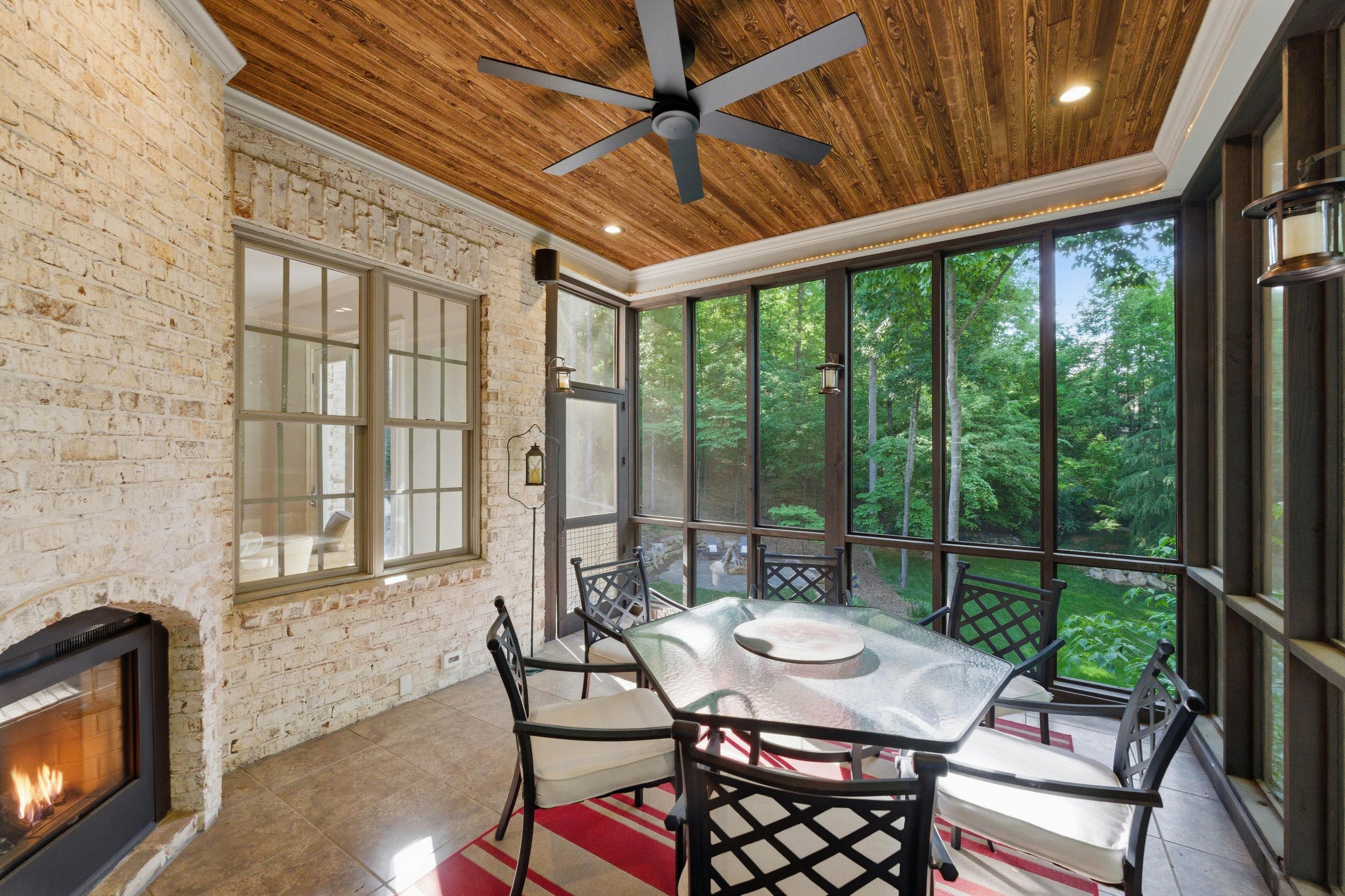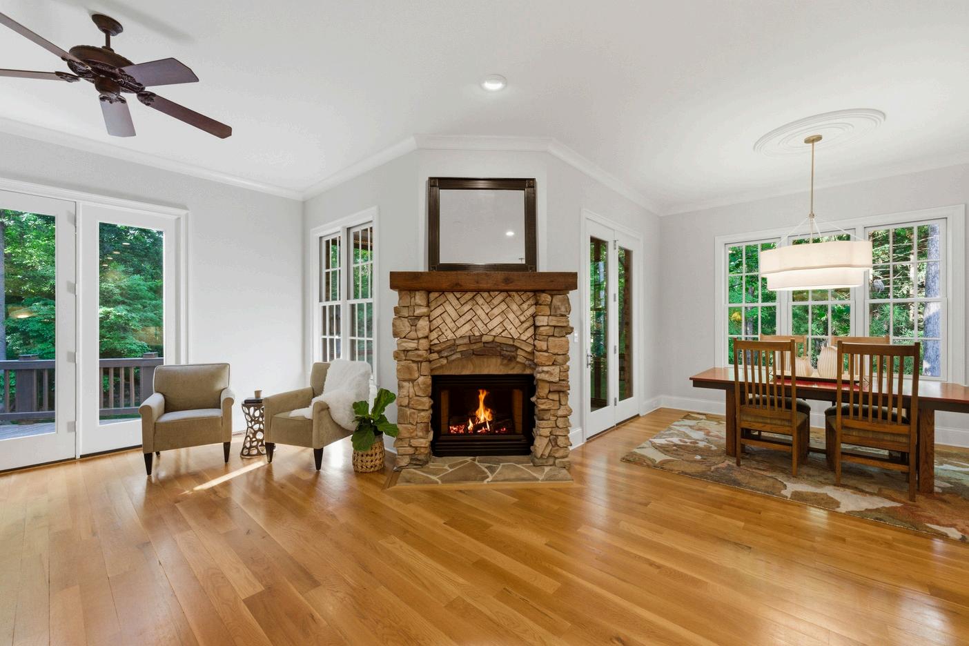 Public Rmrks: Welcome Home to your own private retreat, tucked into a serene wooded cul-de-sac setting just minutes from the conveniences of Matthews and Charlotte. This custom all-brick residence offers six bedrooms and exceptional living space designed for both everyday comfort and effortless entertaining. Set on a premium lot with abundant open space for recreation, the home blends timeless architecture with a peaceful natural backdrop. Inside, dramatic design elements make an immediate impression, including a 30-foot cedarpaneled ceiling, a dramatic tapered river stone fireplace with solid timber mantel, and a stunning two-story wall of windows that bring the outdoors into the heart of the home. In 2026, the main level was enhanced with curated designer lighting, while the chef’s kitchen was beautifully remodeled with an expansive island and handmade Moroccan Zellige tile. The kitchen flows seamlessly into the breakfast area, keeping room and screened in porch, creating an inviting space for gathering. Main floor living areas with 10' ceilings connect beautifully for entertaining while offering elevated views of the expansive backyard. The main-level primary suite provides convenience and privacy, while the second floor features three spacious bedrooms, each with