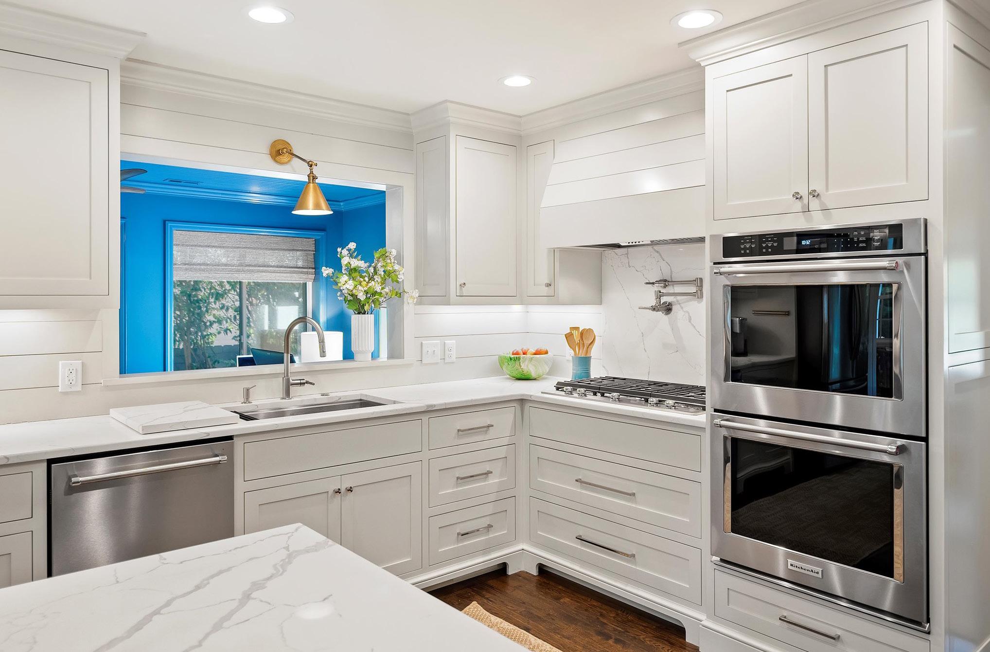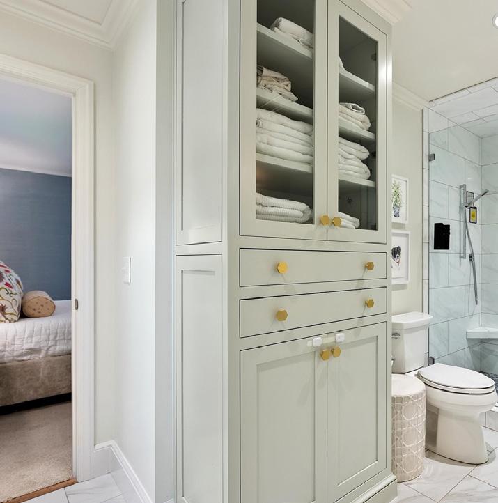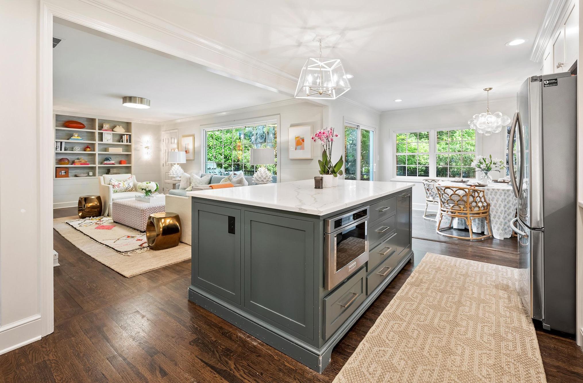 • Island has microwave drawer and shallow cabinets under counter stools for glassware storage, side by side trash and recycling