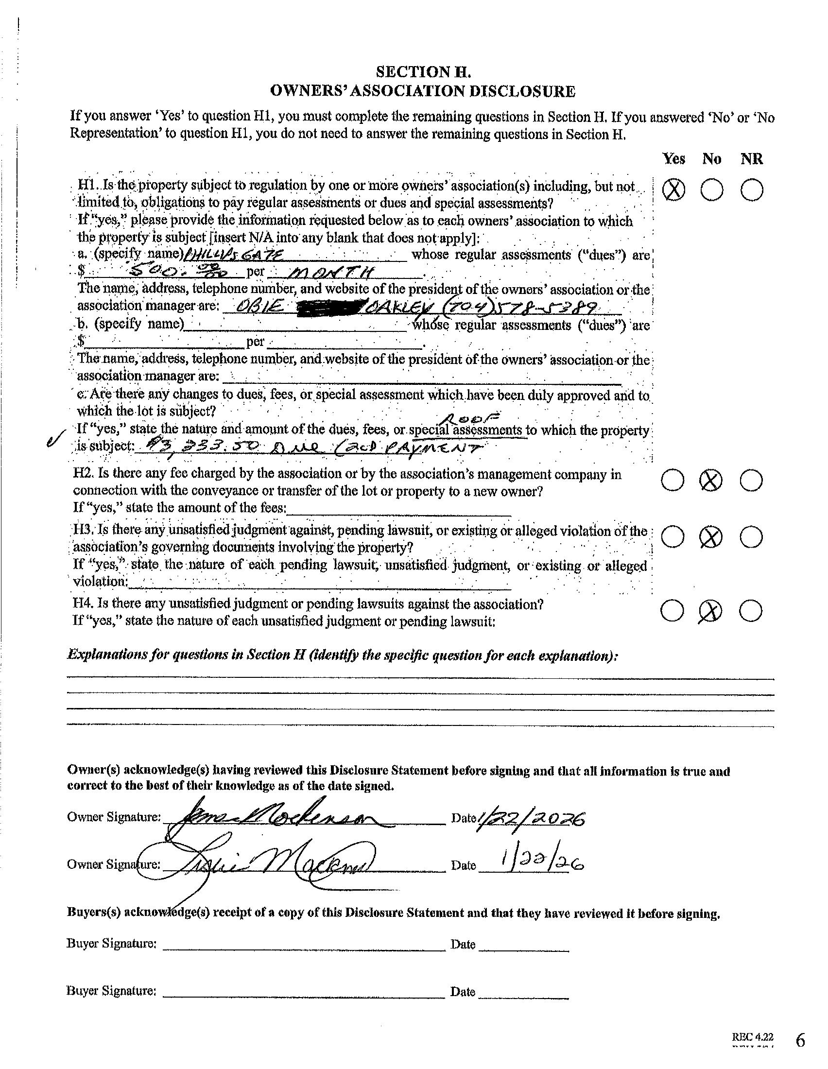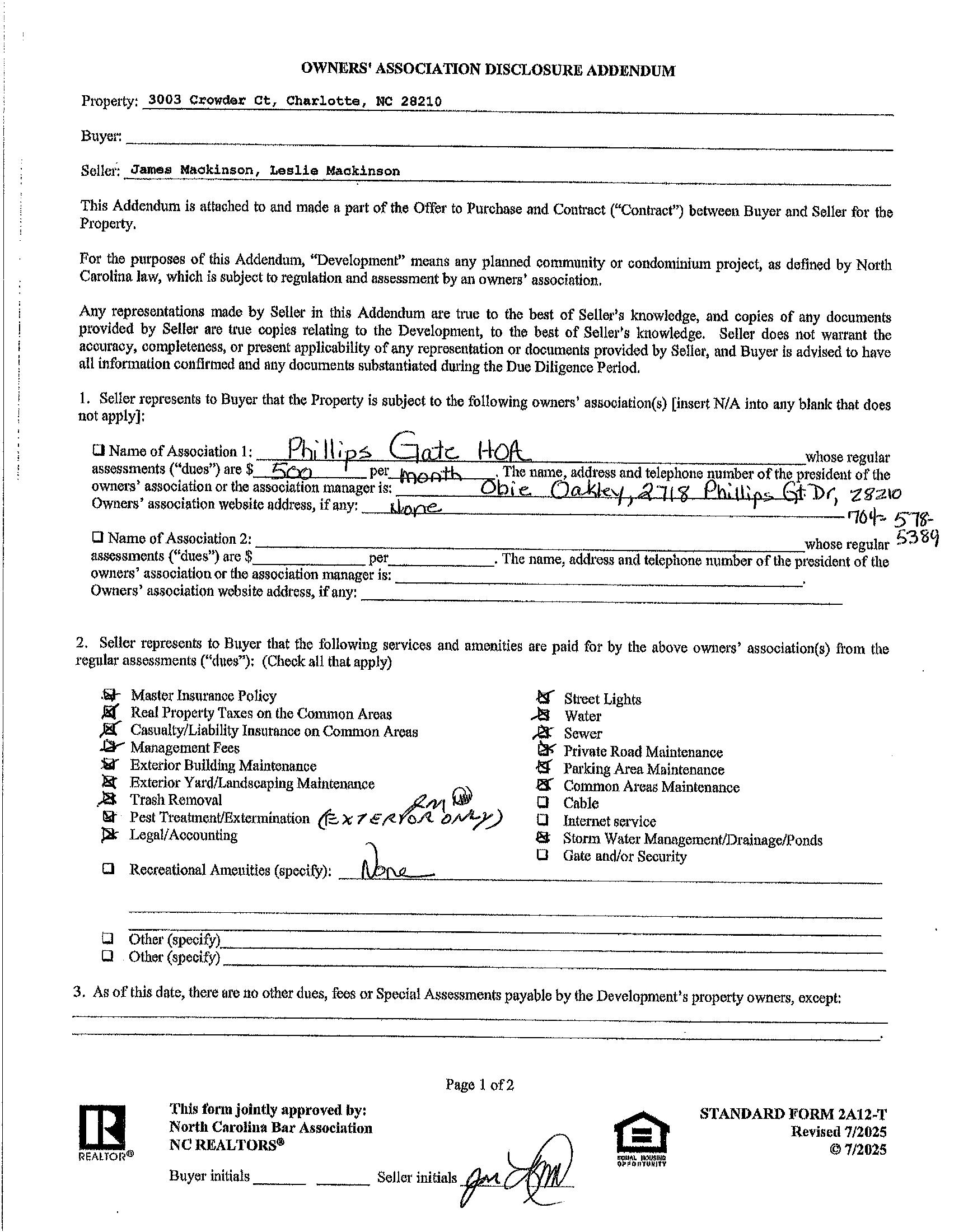 HOA Phone: 7045785389 Assoc Fee: $500/Monthly Spc Assess Cnfrm: Yes/$3,333.50 roof assessment