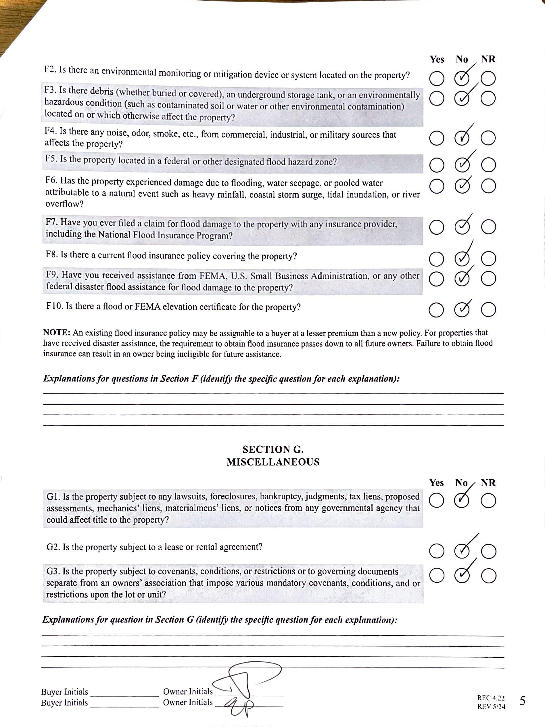 DO NOT assume that an answer of Nor NR is a guarantee of no defect. ff an mvner selects N, that means thl:! owner has no actual knowledge of any defects. It does not mean that a defect does not exist. If an owner selects NR, it could mean the owner (I) has knowledge of an issue and chooses not to disclose it, or (2) simply does not know.
