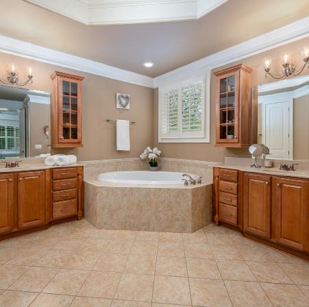 • The spacious main-level Primary Suite is a true retreat—featuring a dramatic trey ceiling, plantation shutters, dual closets, and a spa-inspired bath with soaking tub, walk-in glass shower, dual vanities, and private water closet.