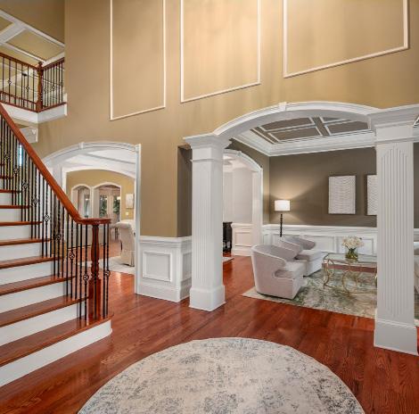 • Step into elegance through the two-story foyer where soaring ceilings, gleaming hardwoods, intricate millwork, and dual staircases set a refined tone.