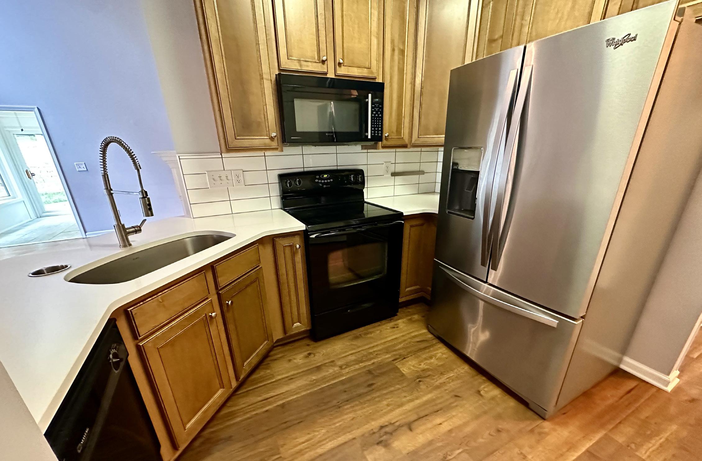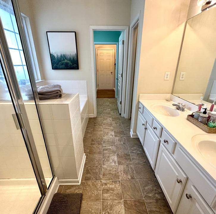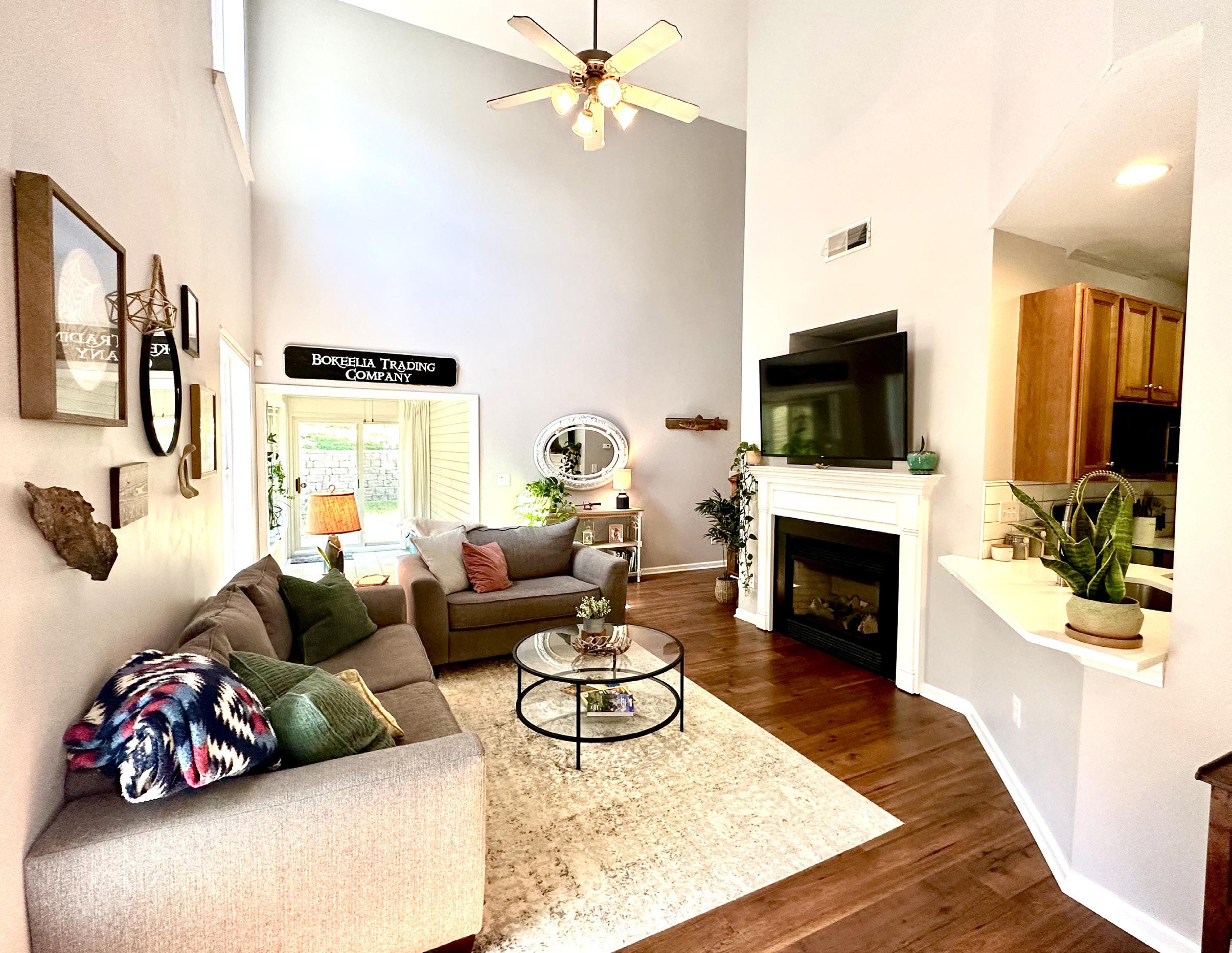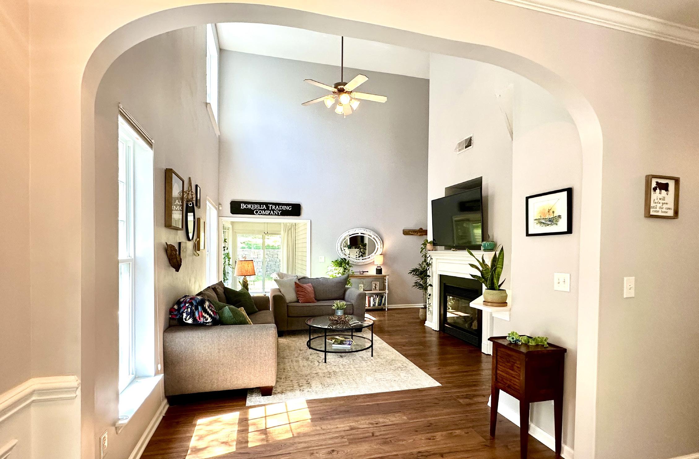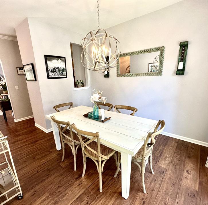 offers a fantastic open airy floorplan w./ primary BR on main and multipurpose loft upstairs. Kitchen features updated quartz counters & tile backsplash (fridge, washer & dryer incl). Open 2-story living room opens onto kitchen & sunroom & features laminate hardwood flooring. Spacious primary BR overlooks private backyard & has a huge walk-in closet & cathedral ceiling. Primary bath provides a spa like feel w./ dual vanity, separate shower/soaking tub & plenty of space. Upstairs has 2 BR's and large bath in addition to the loft workspace. Beautiful fenced in backyard features a retractable awning over stone patio, perfect for entertaining! (Don't miss the storage shed). Blinds throughout, unique dining room light fixture as well as updated kitchen. Community offers great amenities including a pool and playground. Just minutes from shopping, dining and 485! A rare gem!