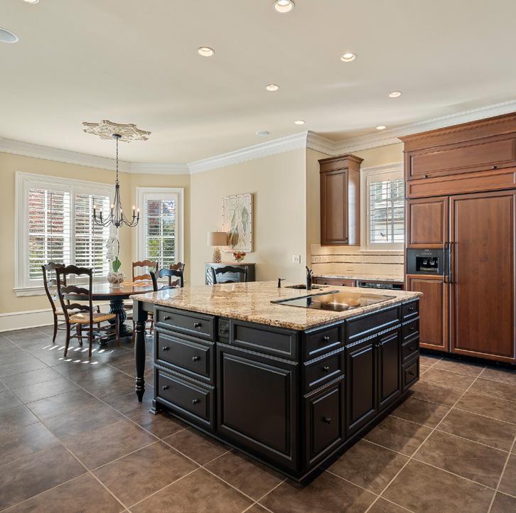 • Kitchen features beautiful cabinetry with a mahogany finish, roll up under-cabinet opening between kitchen and pantry (easy access to the larger appliances and a perfect way to store them), Center Island with a black painted finish, granite counters and tile backsplash.