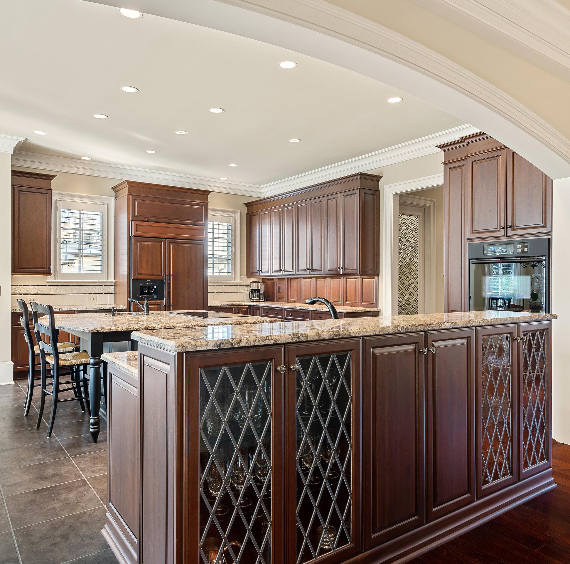 • Attractive China cabinet between the kitchen and great room accented with glass fronts and puck lighting.