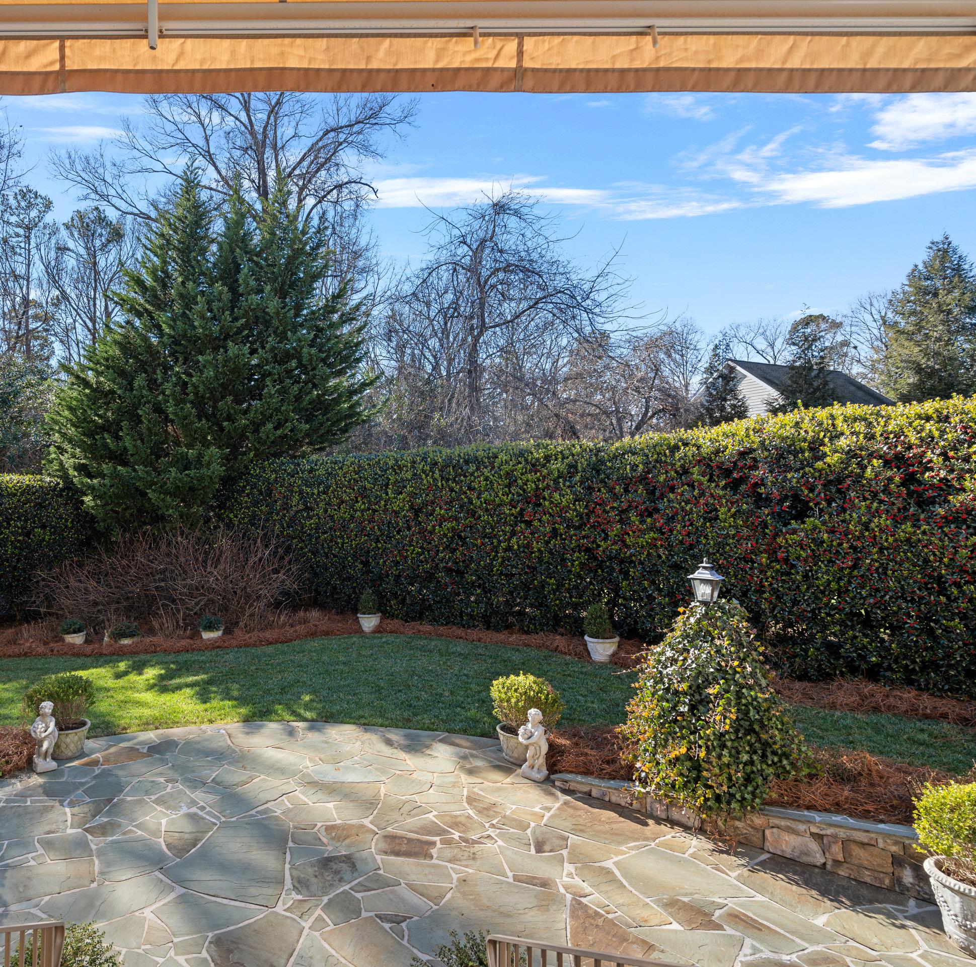 • Covered back porch and stone patio. Large mechanical awning that extends and retracts on command