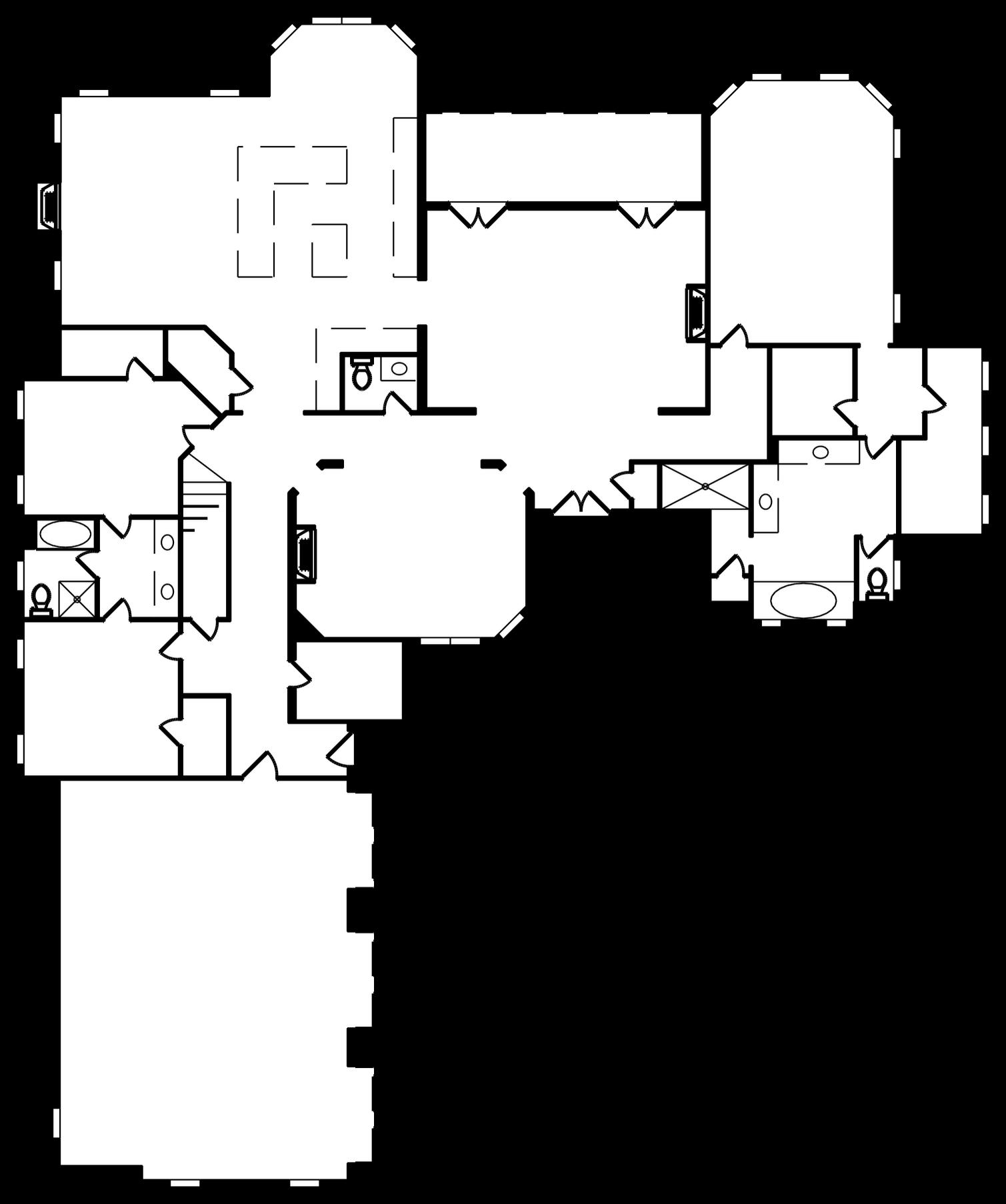 • Hallway transverses the home left to right – connecting primary suite at one end of the home, all the living spaces, and guest suites and stairs to bonus at the other end