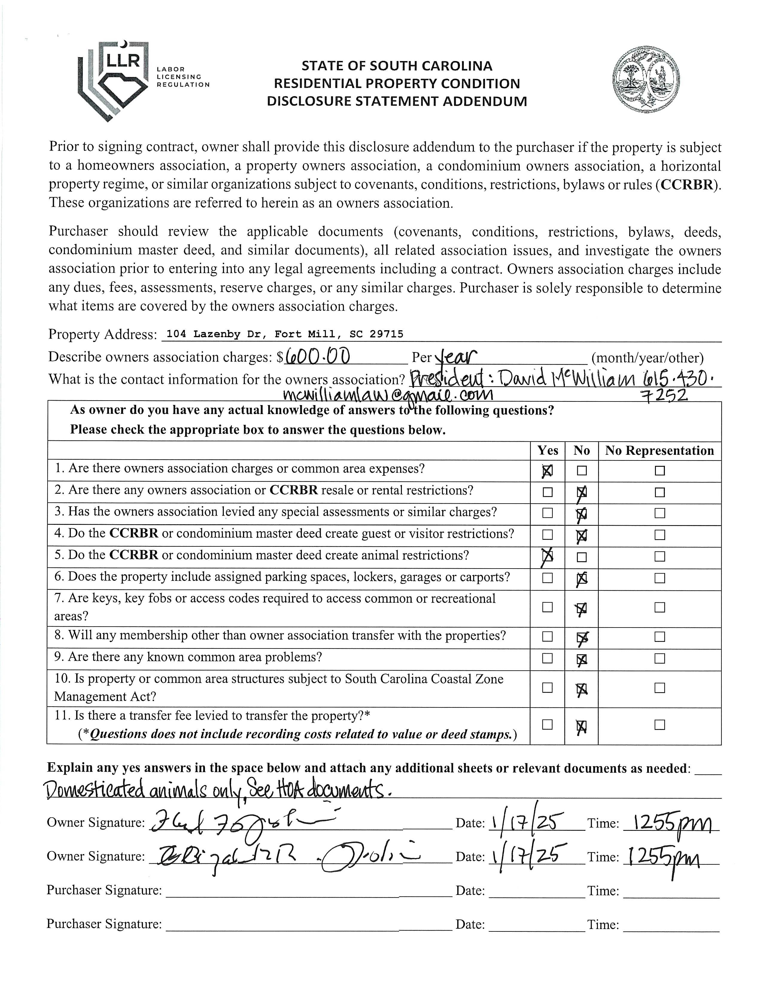 HOA Mangemnt: Self managed- President David McWilliam