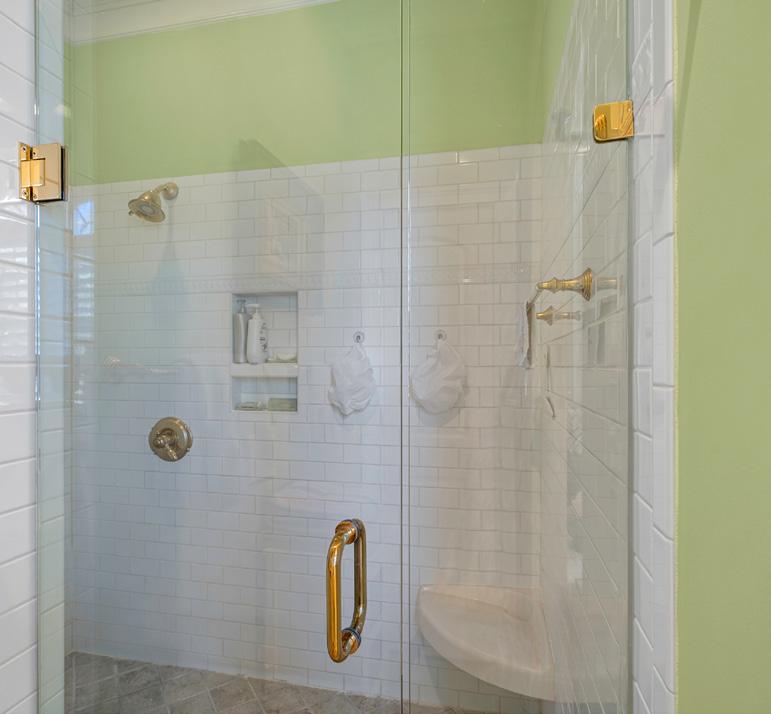 • Generous walk-in closet with white tile and frameless glass door