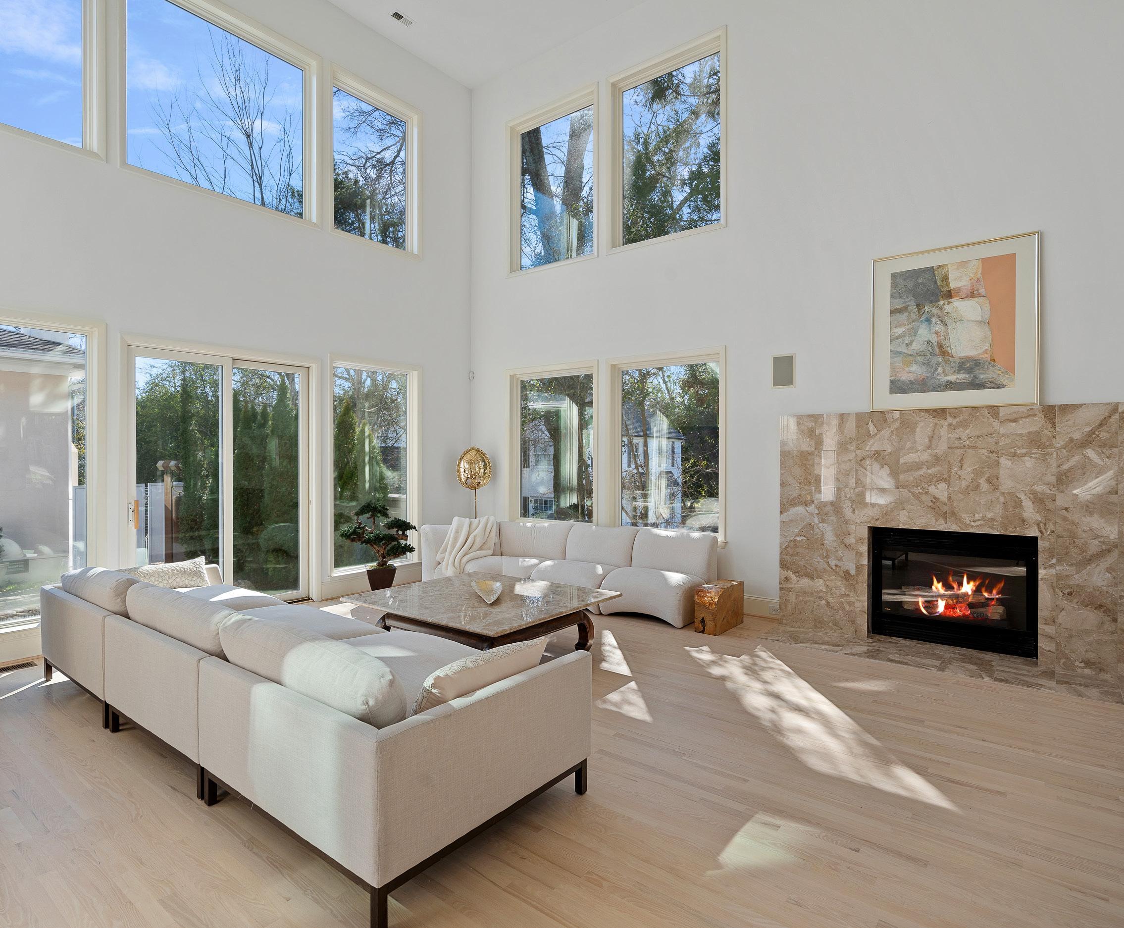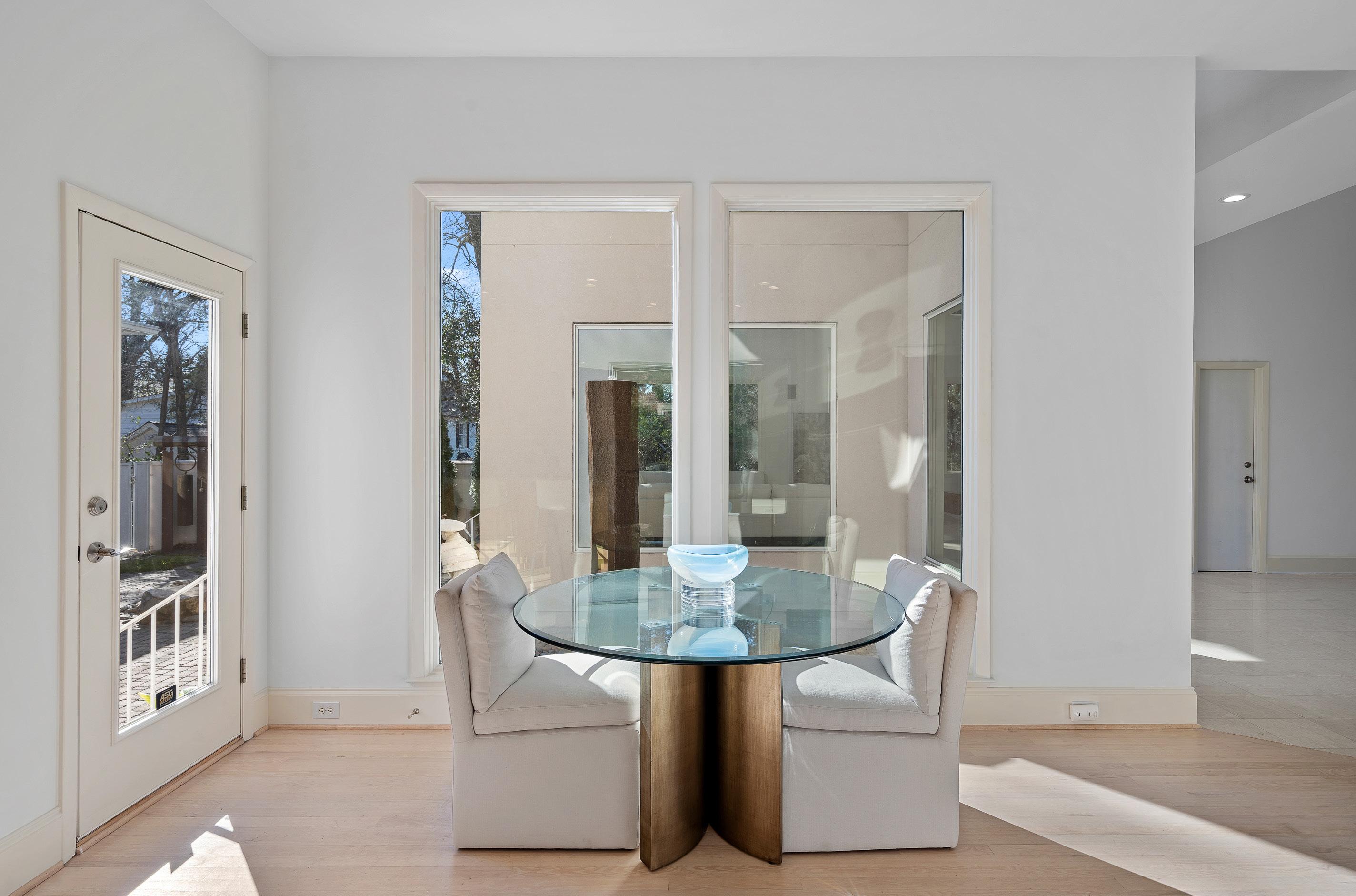 • Surrounded by walls of windows overlooking sculpture garden patio and fountains, a light and bright space for entertaining and day-to-day living
