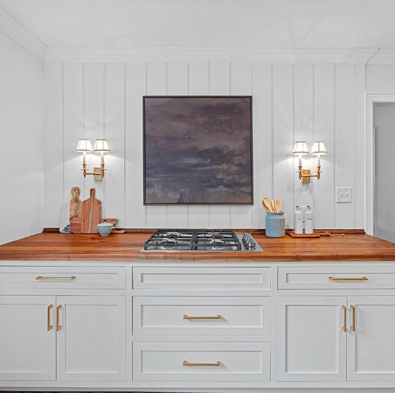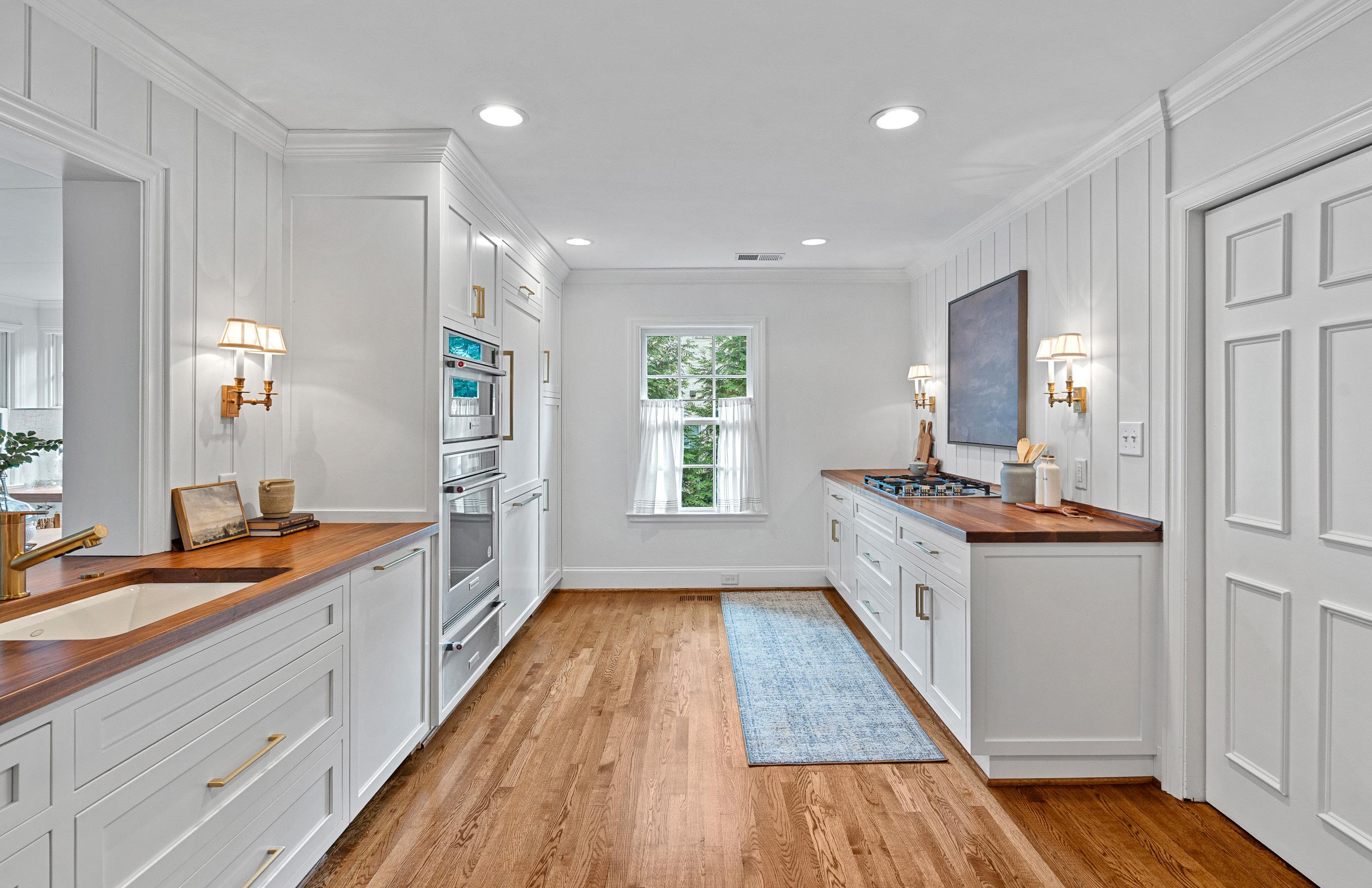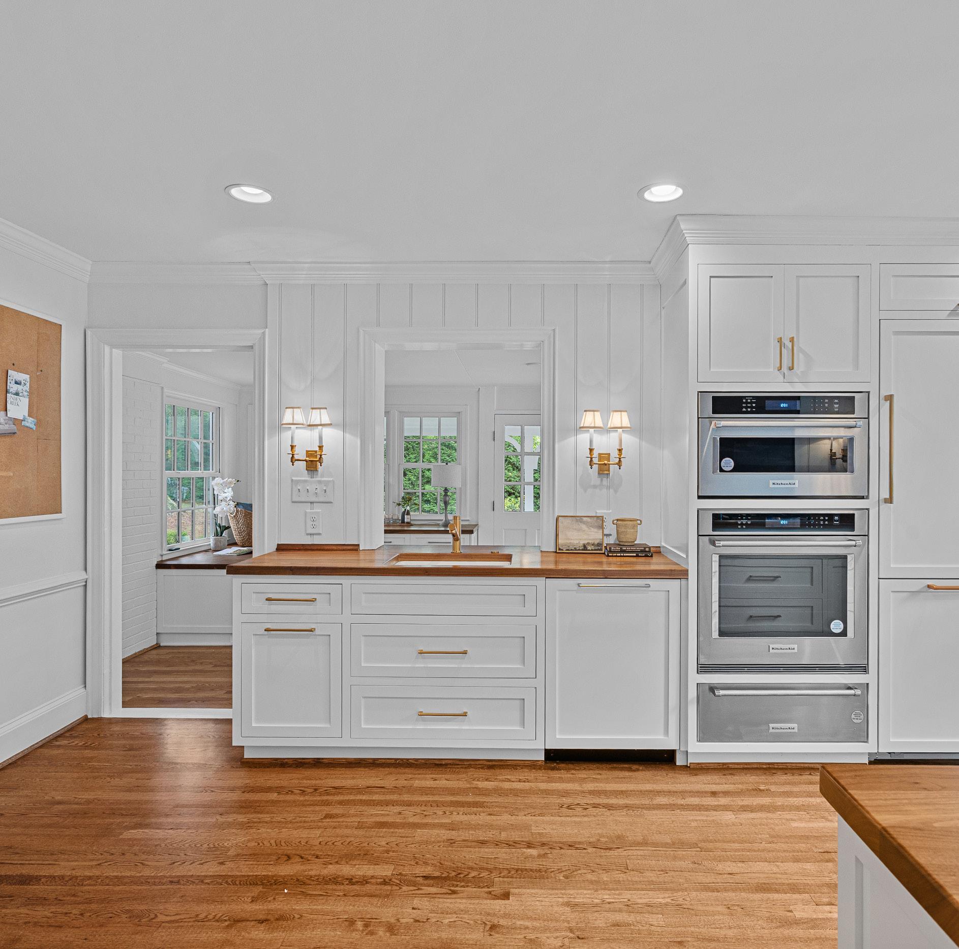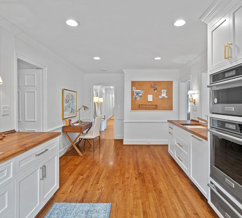• The kitchen is a true highlight boasting custom cabinetry, warm butcher-block counters and KitchenAid appliances including a warming drawer