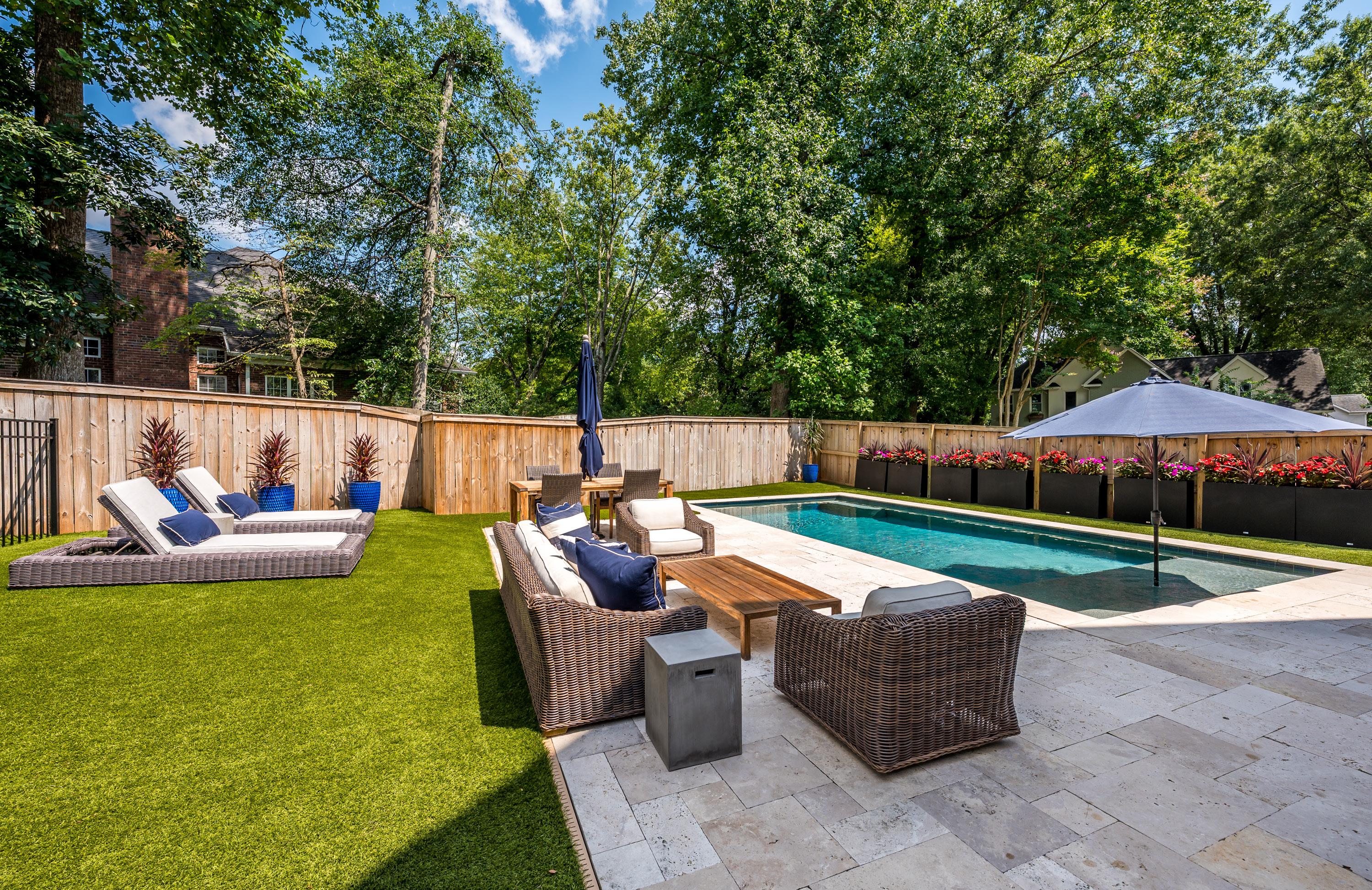 Step outside to a private, fully fenced backyard designed for year round luxury living. The professionally renovated landscape includes a saltwater PebbleTec pool with heater, seven person Caldera Spa, travertine decking, oversized screened porch, over 4,000 sq ft of premium synthetic turf, quartzite gravel, tiered stone terrace walls and steps, landscape lighting, paver patio, and a comprehensive drainage system.