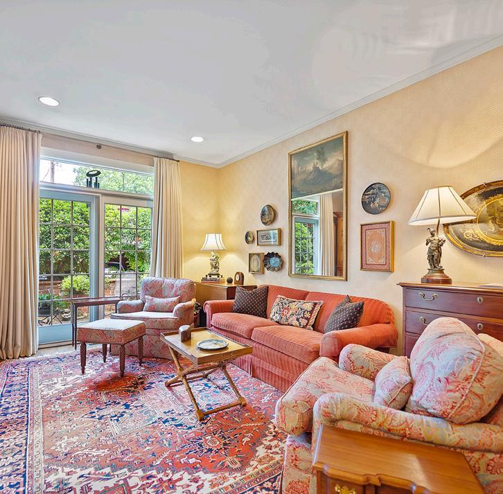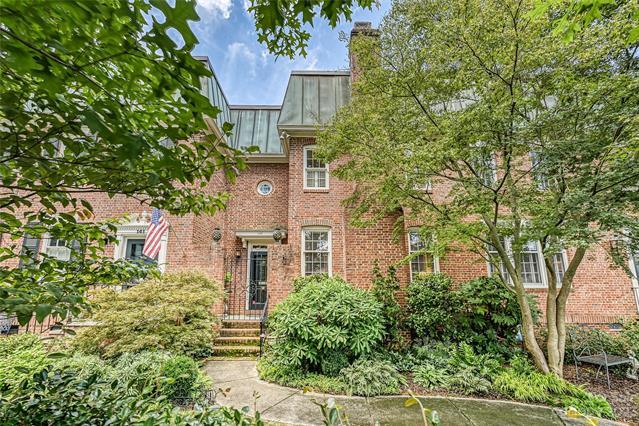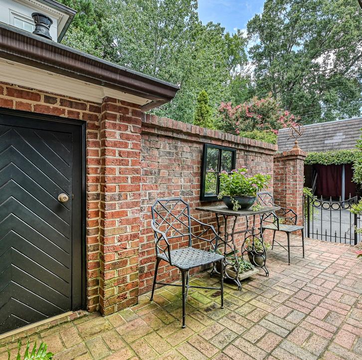 Mature landscaping and winding walkway lead to the elegant gated front porch. The gas lantern-lined street is a true gem as it provides wonderful privacy yet is close to restaurants/shops. Step inside to gleaming hardwood floors and a sophisticated and timeless living space with stunning architectural bookcases and fireplace in the open living and dining space. Kitchen overlooks the private brick patio-has stainless appliances, walk-in pantry, granite countertops, island and breakfast area adjoining the inviting den. Entertain on beautiful brick porch with gorgeous privacy hedge, utility room, in-ground gas grill area opens to view of common space and drive with carport and storage closets. Upstairsspacious primary suite- walk-in closet, updated bathroommarble counter. Two additional bedrooms. Second full bathroom and laundry complete upper level. Walk-up attic is fully insulated- incredible amount of storage.