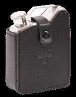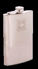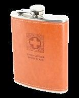 Flachmann aus Chromstahl mit Lederumschlag, mit geprägtem Offiziersgurt-Wappen, sehr robust, kompakt und stilvoll