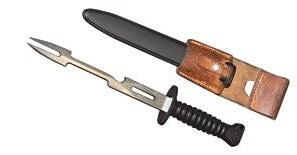 Original Bajonett 57 umgewandelt zu einer Grillgabel mit Flaschenöffner, mit Prägung Wenger oder Victorinox. inkl. Scheide + Lederfrosch