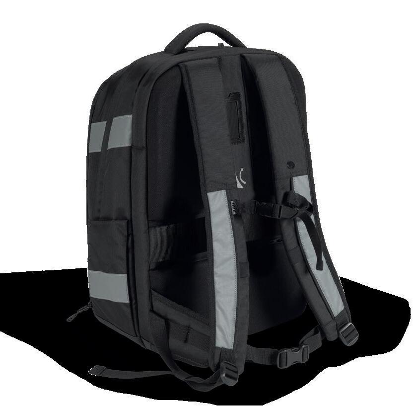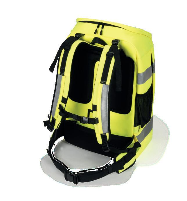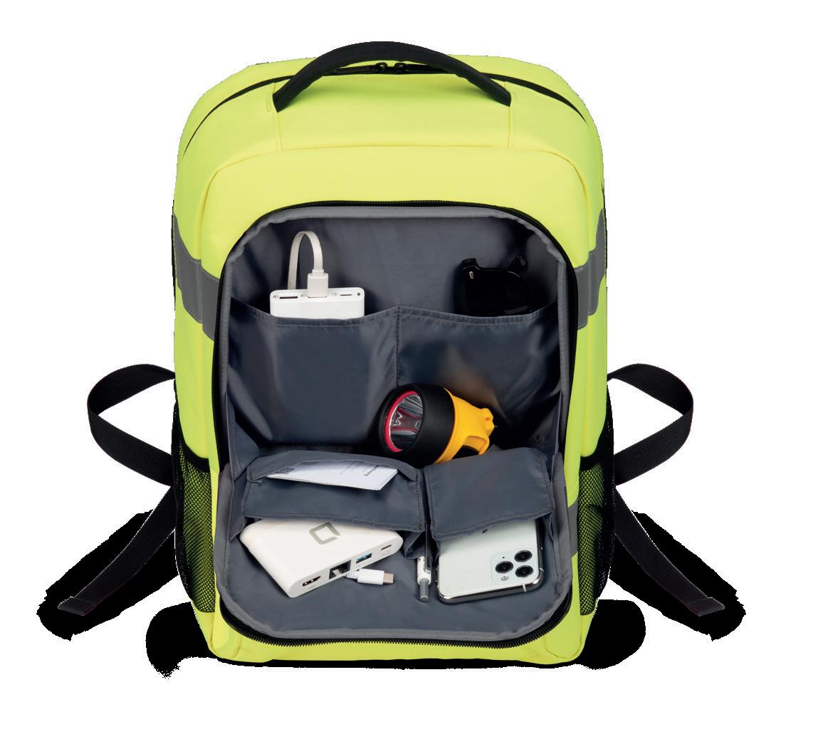 Well-designed interior compartments support structured workflows, while the high-visibility materials provide additional safety, especially in the public transport sector, on railway and construction sites, and on the daily commute to work. The water repellent outer material in accordance with EN ISO 4920, Level 4, and the integrated rain cover offer reliable protection in bad weather.
