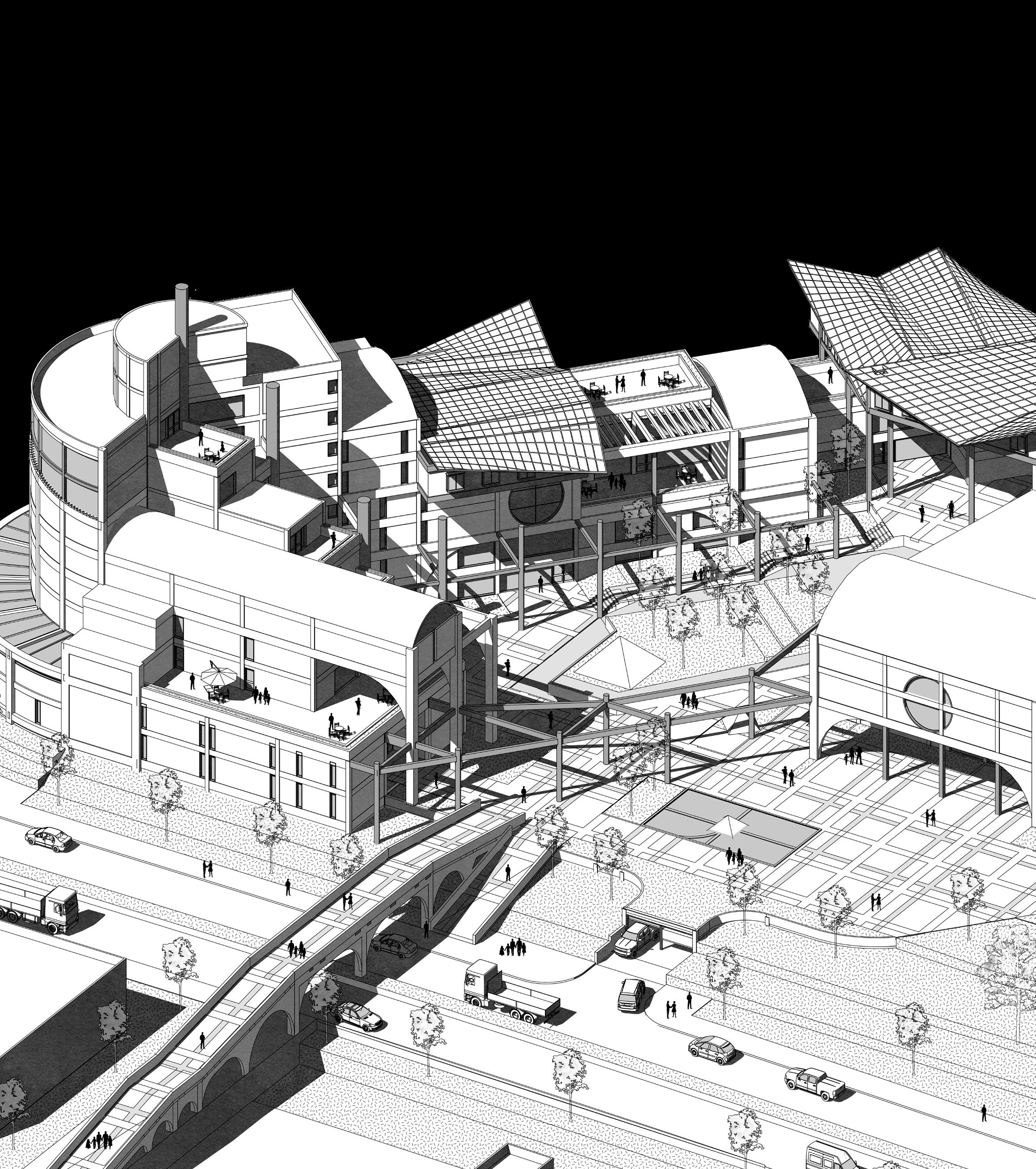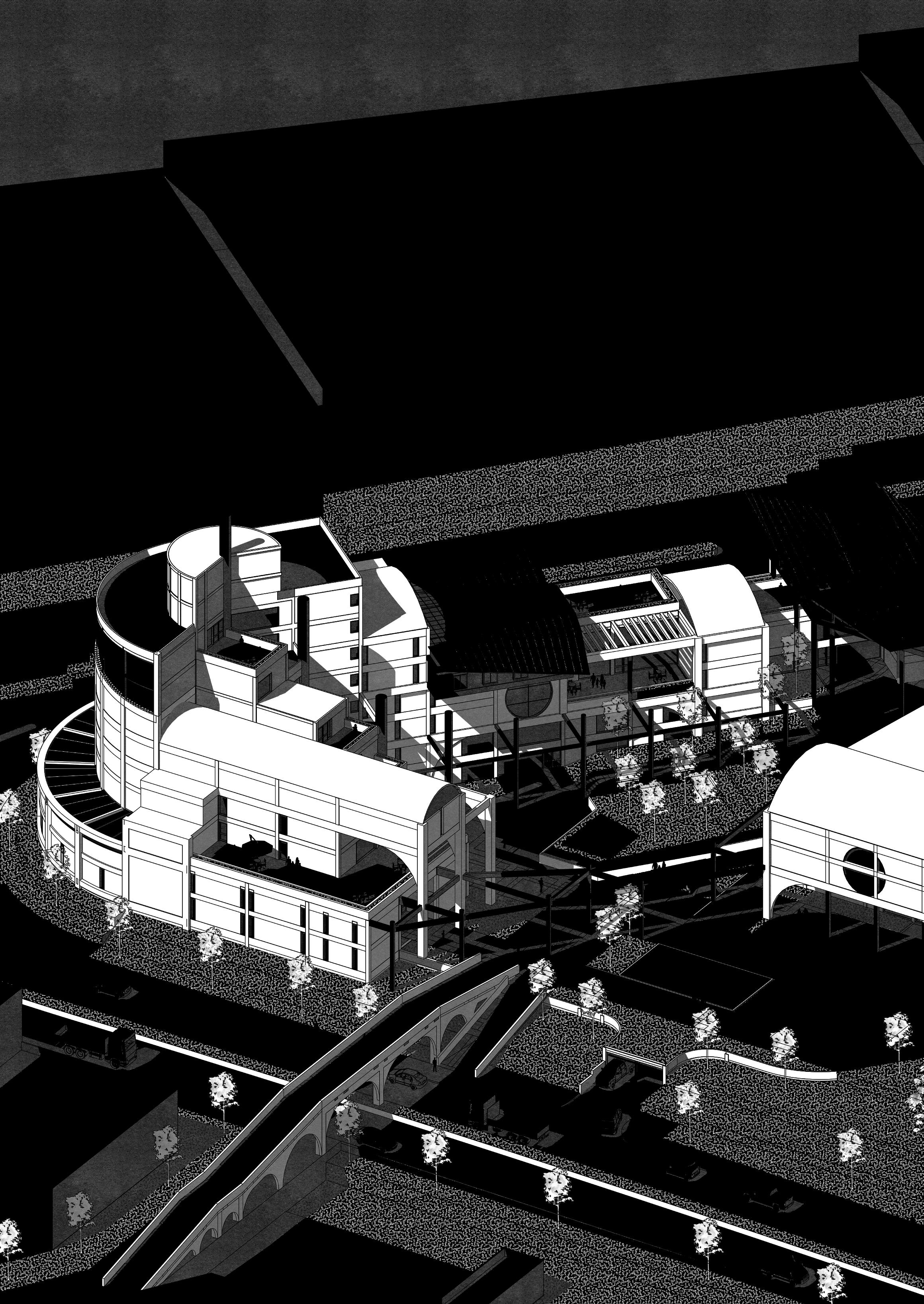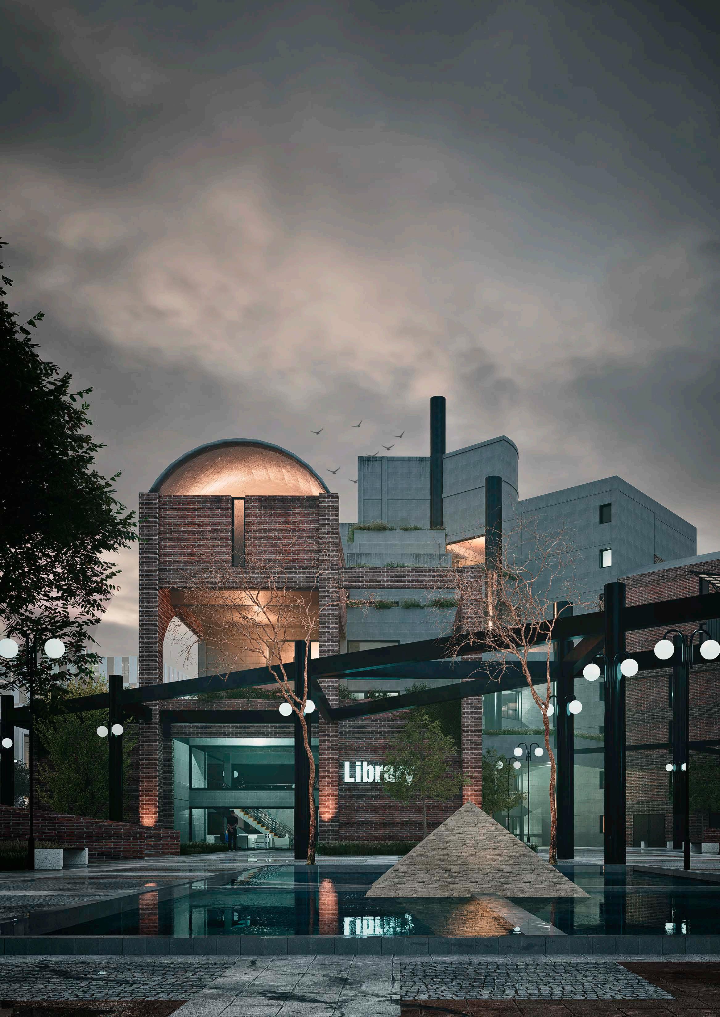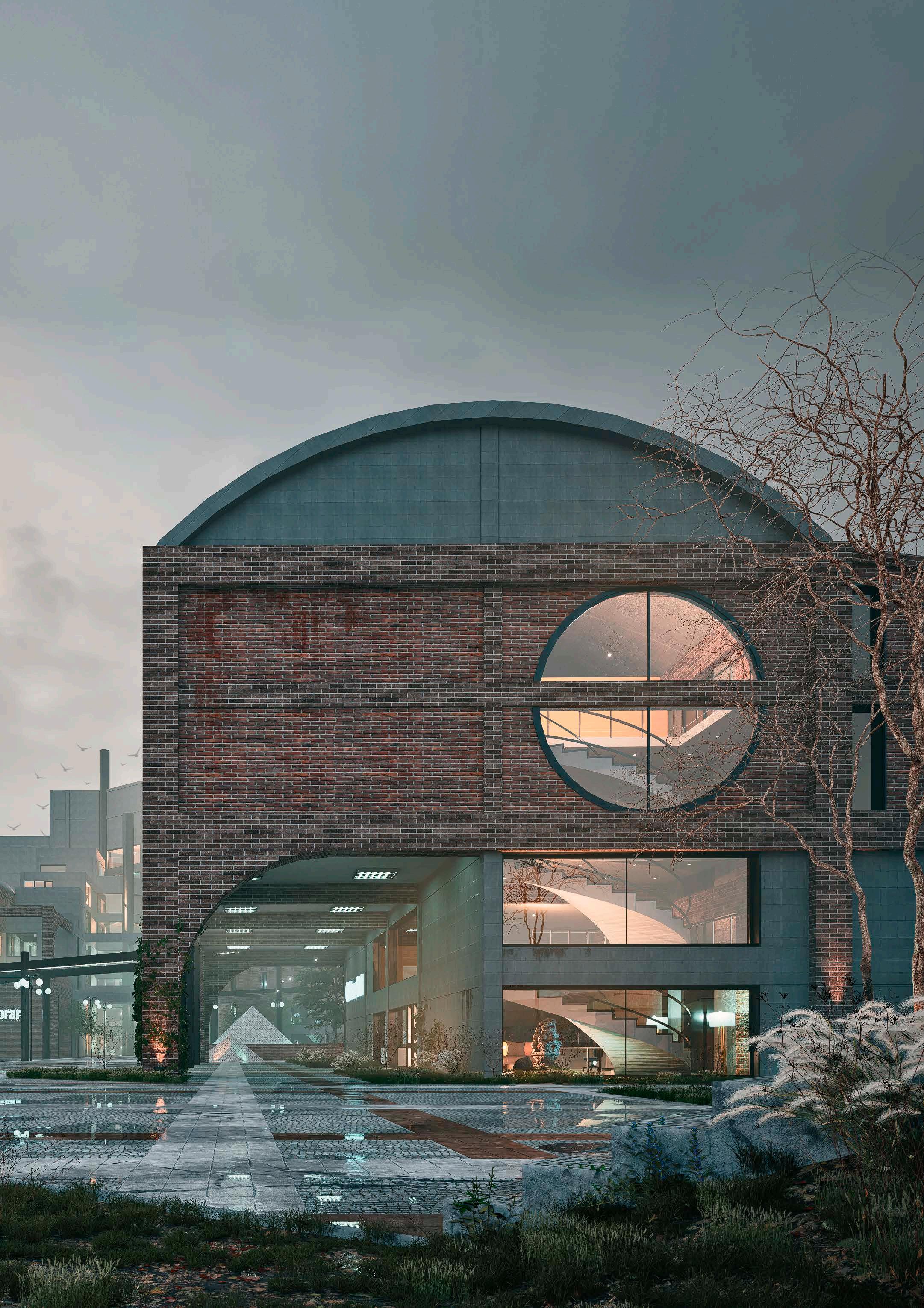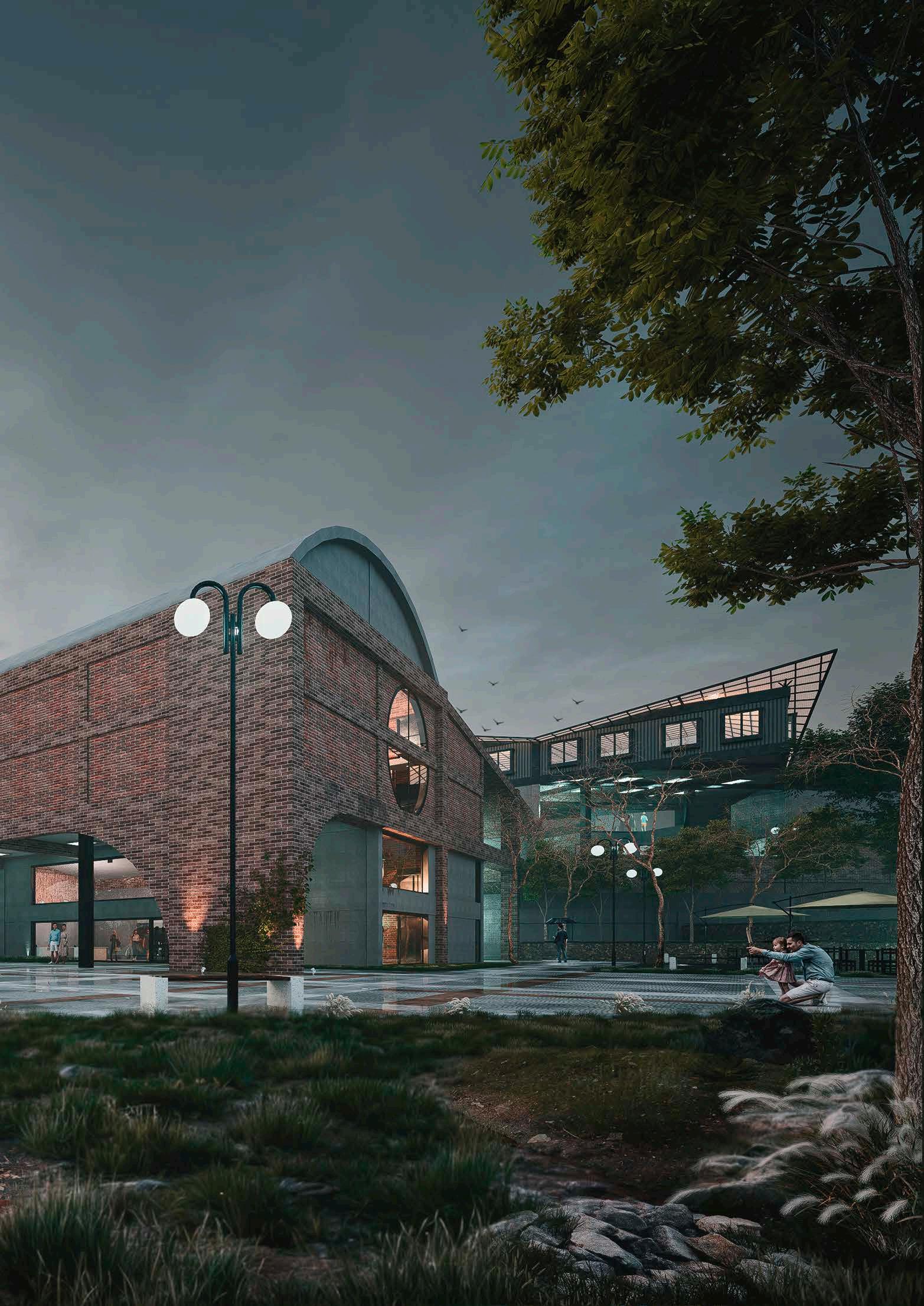 This multifunctional complex houses office buildings, a university, commercial areas, business incubator, research center, library and auditorium. Its design embraces complexity and contradiction through the use of technological elements combined with a brutalist aesthetic. The architecture is characterized by a careful juxtaposition of forms and textures, where analog elements such as arches and vaults intertwine with artificial ruins, creating a dynamic and stimulating environment. The diversity of architectural styles and patterns merges into a unique collage that reflects the entrepreneurial dynamism and innovation that the park seeks to foster.