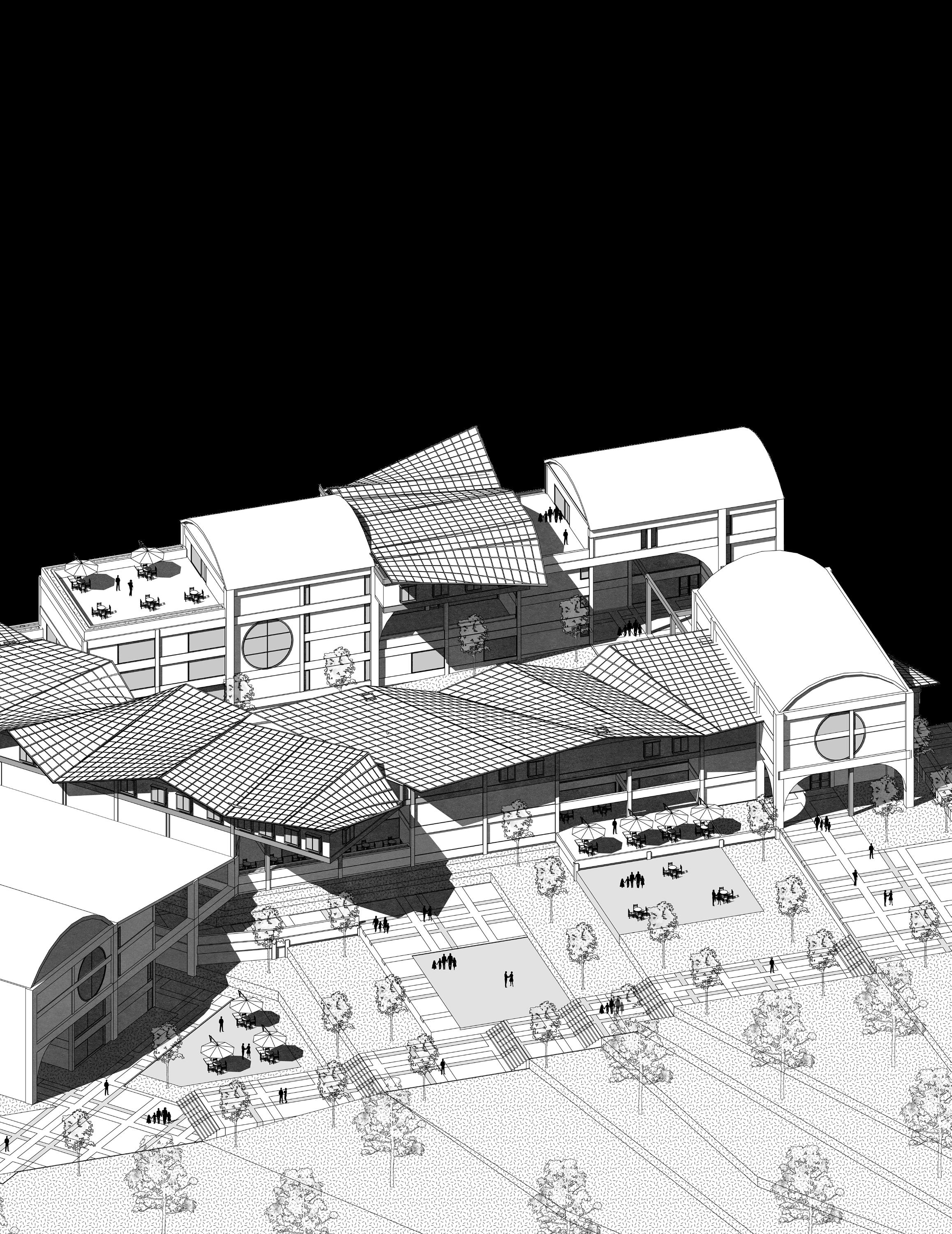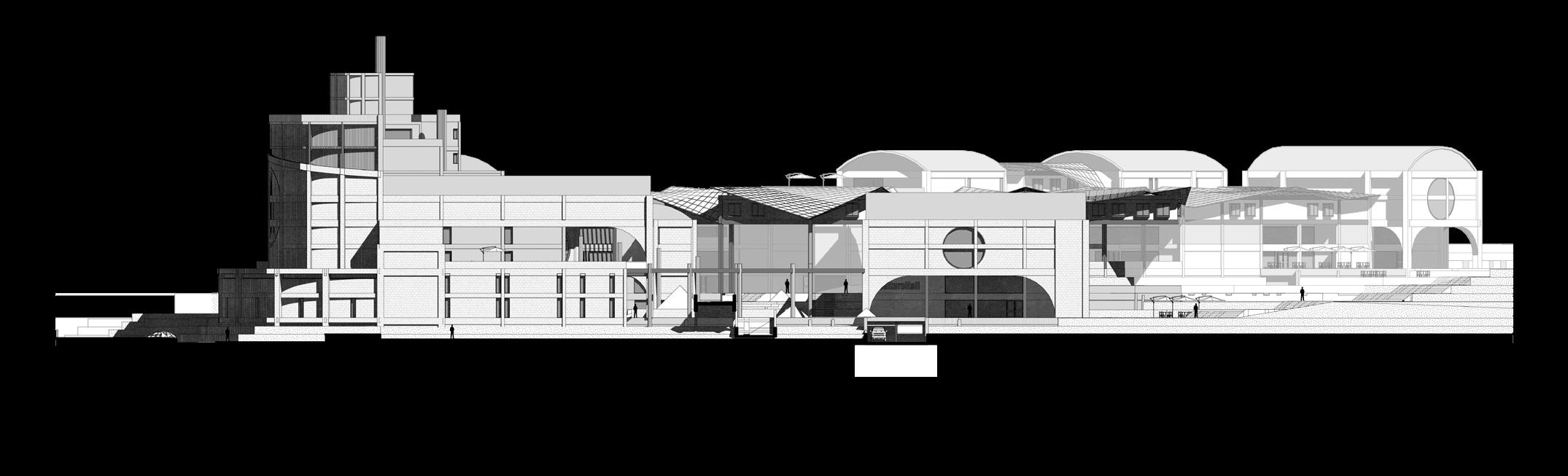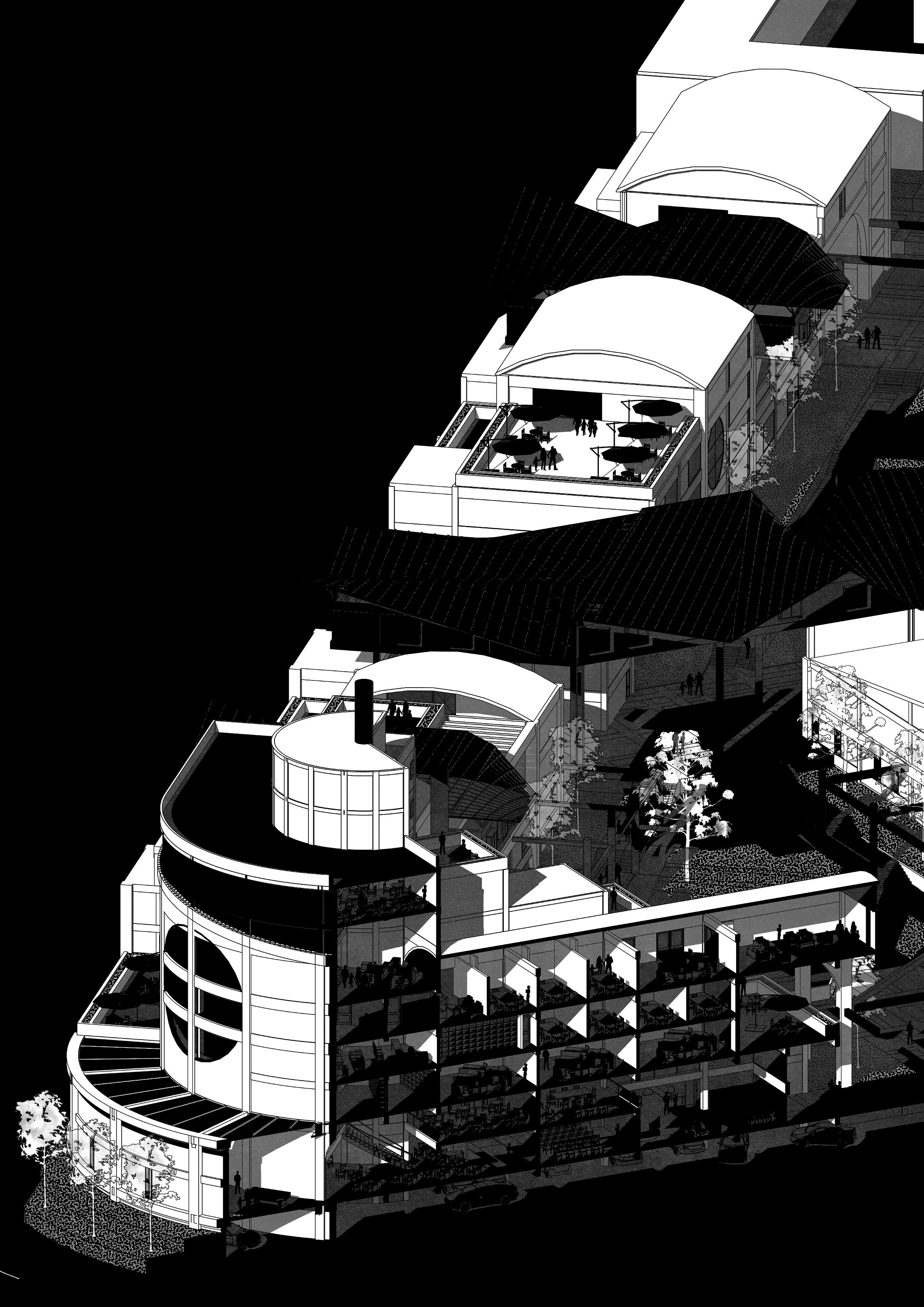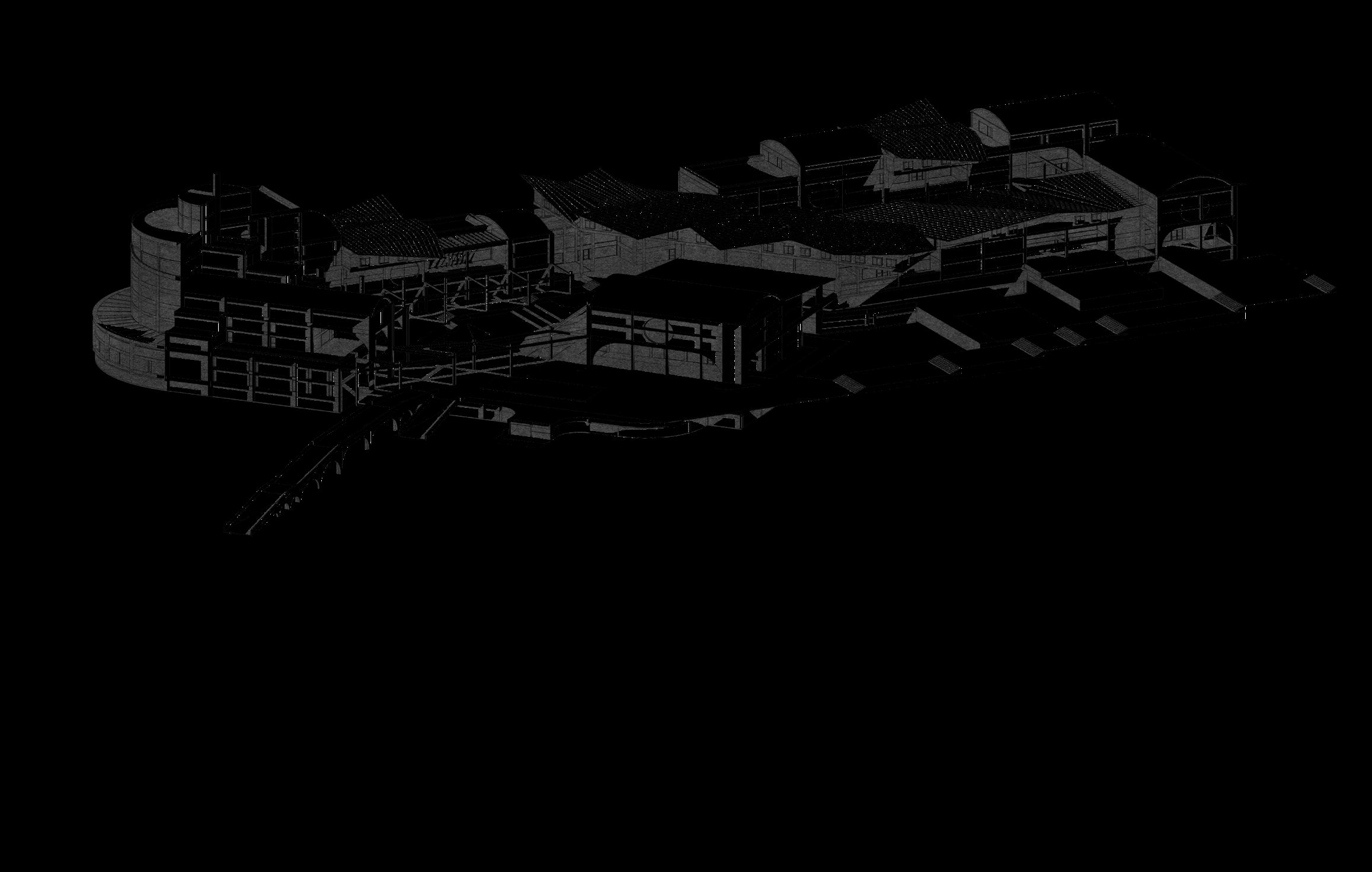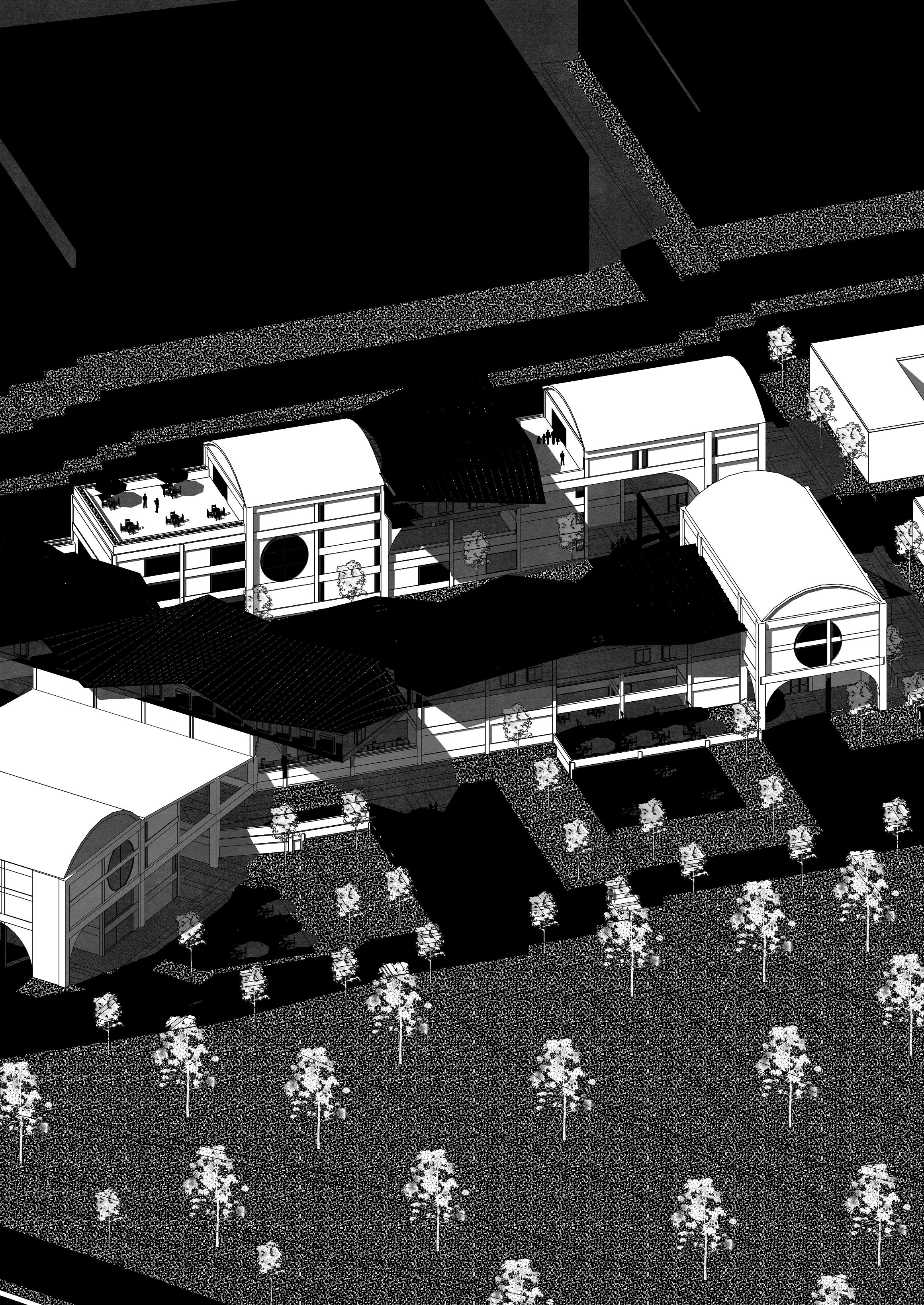 This multifunctional complex houses office buildings, a university, commercial areas, business incubator, research center, library and auditorium. Its design embraces complexity and contradiction through the use of technological elements combined with a brutalist aesthetic. The architecture is characterized by a careful juxtaposition of forms and textures, where analog elements such as arches and vaults intertwine with artificial ruins, creating a dynamic and stimulating environment. The diversity of architectural styles and patterns merges into a unique collage that reflects the entrepreneurial dynamism and innovation that the park seeks to foster.