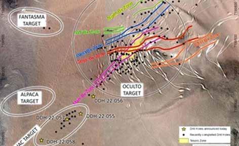 El pozo DDH 22-056, perforado entre el depósito Oculto y el target JAC, interceptó una zona de mineralización de plata en óxidos amplia, con 57,5 metros con una ley de 141 g/t plata (y 0,27 g/t oro), a partir de 110 metros en el fondo del pozo. incluyendo 11,0 metros con una ley de 549 g/t plata y 0,72 g/t oro.