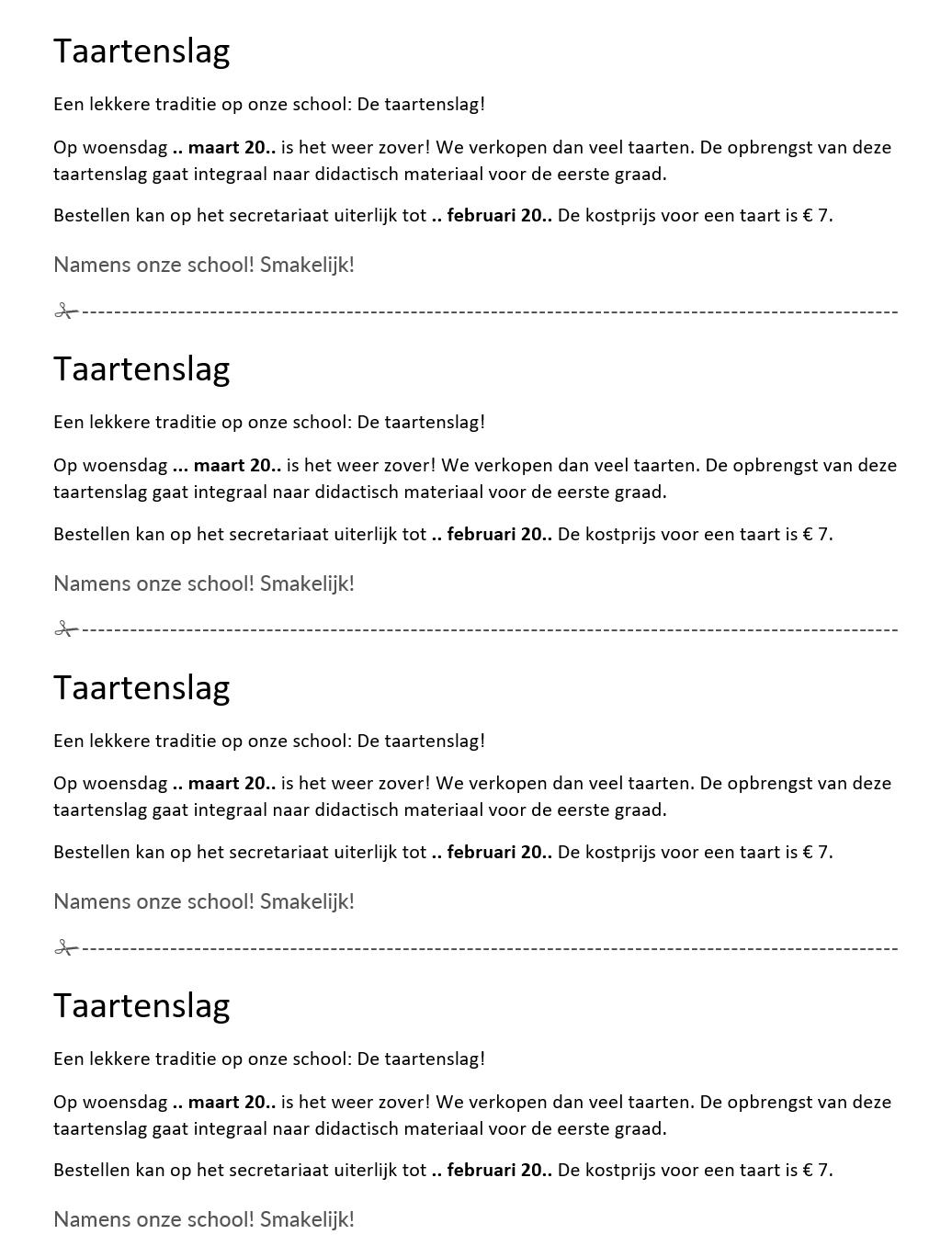 Je krijgt een korte tekst over de taartenslag op school. Kopieer deze tekst meerdere keren op een pagina. Bewaar je document: oplStrooifolder