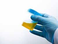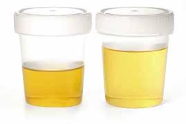 25 In de nieren wordt de urine aangemaakt. De kleur van de urine, zie figuur hieronder, toont of een persoon voldoende drinkt.