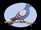 De dikke duif Dollie zit op een tak.