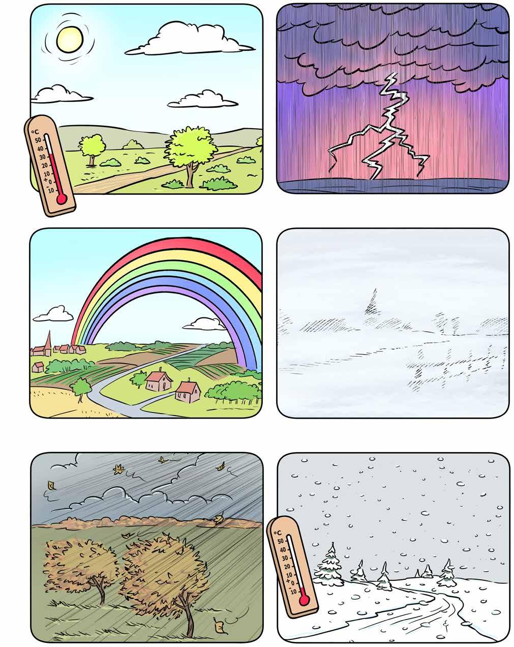 Les nuages cachent le soleil. de wolk la pluie Je n’aime pas la pluie en vacances ! de regen le vent Il y a beaucoup de vent à la plage. de wind le brouillard Je ne vois pas bien à cause du brouillard. de mist