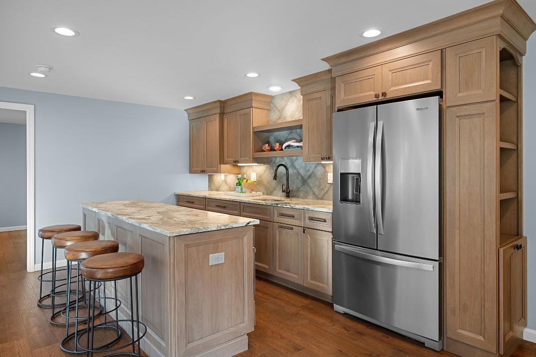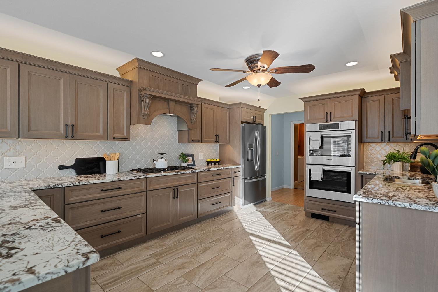 This stunning move-in ready and stylish 5-bedroom, 3-bathroom ranch has been completely re-imagined with a new addition, a luxury kitchen, over 3,600 square feet of living space, and a fully finished lower level that is an entertainer's dream! Perfect for everyday living or entertaining in style! Step inside to a spacious living and dining room combination with a vaulted ceiling and fireplace The back addition features an expansive luxury kitchen with vaulted ceiling,custom cabinetry,granite counters,arabesque backsplash,a 36-inch, 5-burner gas cooktop, double wall ovens, a drawer microwave, recessed refrigerator, custom vented hood, crown molding, and designer lighting The primary suite boasts plenty of natural light, fresh paint, new carpeting, and a large primary bathroom with dual sinks and a separate tub and shower This home has a split-bedroom floor plan with two additional bedrooms, a full bathroom, and laundry completing the main floor The partially finished lower level (2019) is an entertainer?s paradise with an open staircase, French oak flooring, a luxury bathroom with a marble vanity, two spacious bedrooms, a custom bar with suede marble counters, cabinetry, convection microwave, abundant storage, and custom shelving Additional upgrades include some new windows, a new roof scheduled for 2025, a tankless hot water heater from 2021, and new decking in 2025 Thoughtful design and high-end finishes make this home perfect for everyday living and entertaining in style! This home is not to be missed!