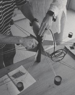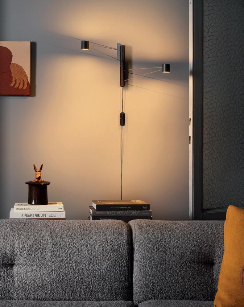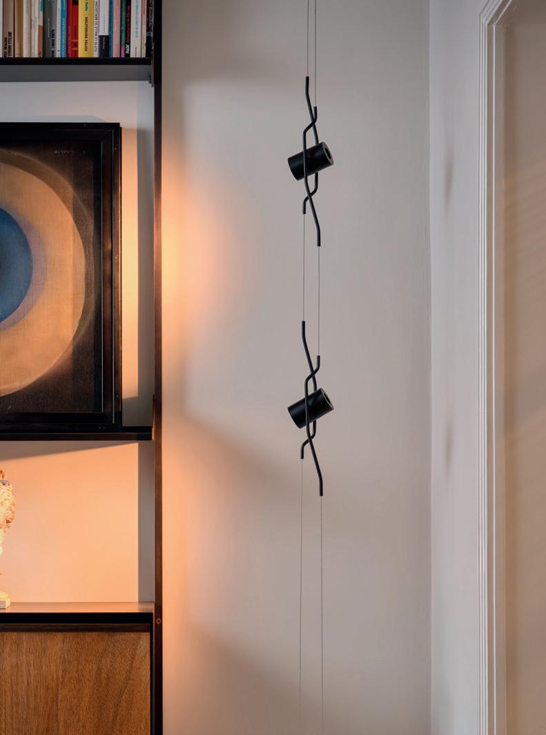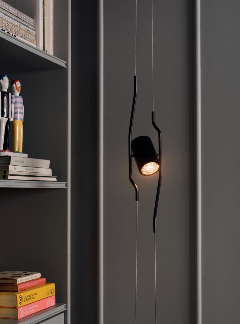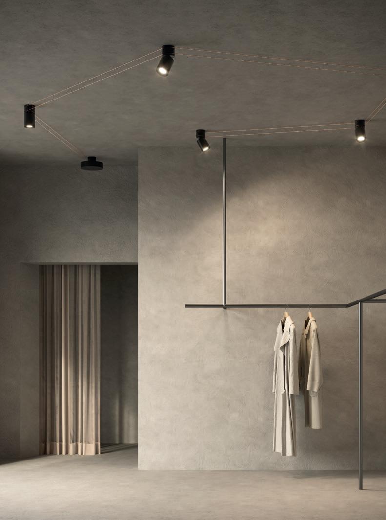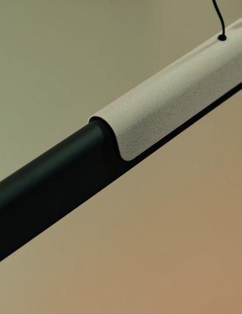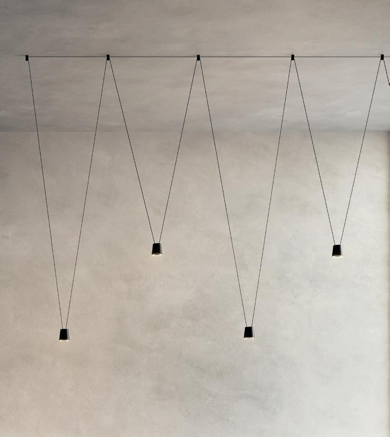 FR Deux câbles tendus entre plafond et sol définissent un champ vertical où le diffuseur glisse, s’arrête et s’oriente. Aucun câble supplémentaire : la structure est l’alimentation. Tendu transforme la tension en liberté. Il se place là où c’est nécessaire, s’oriente selon les besoins et éclaire avec précision.