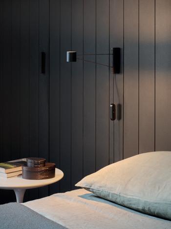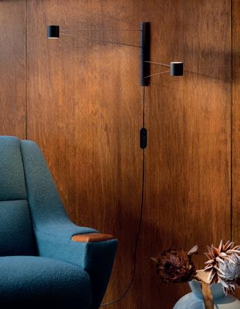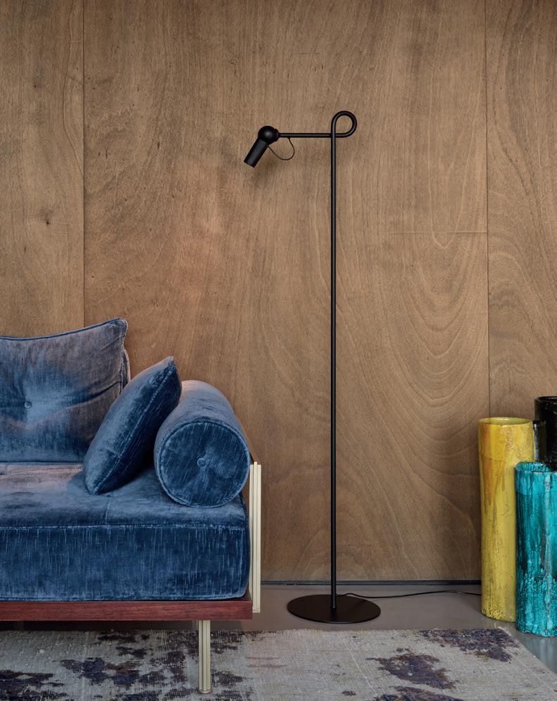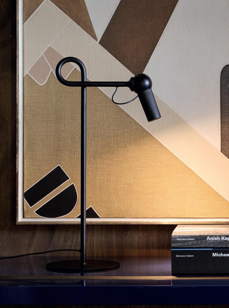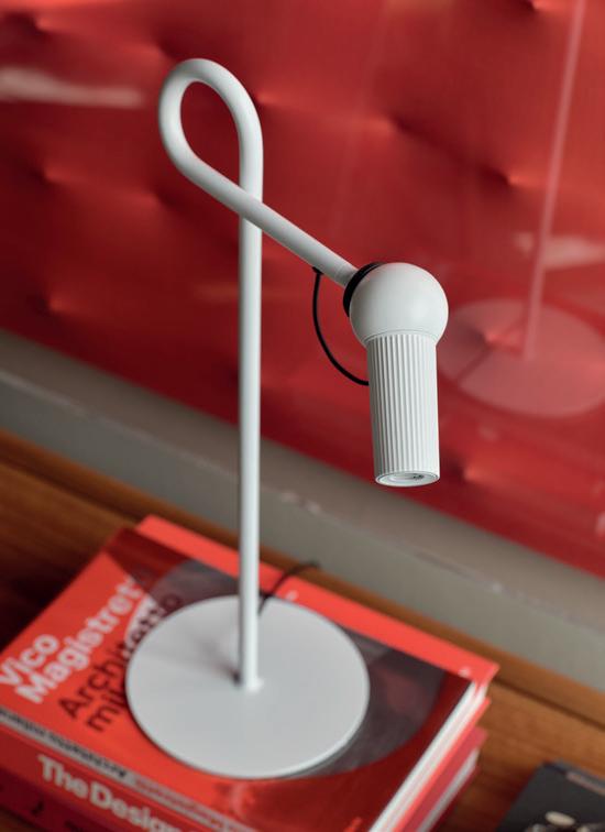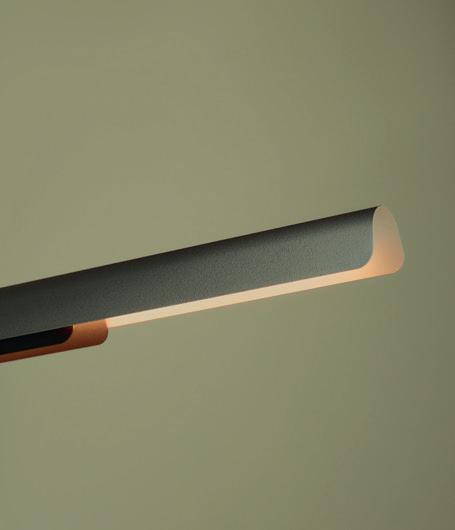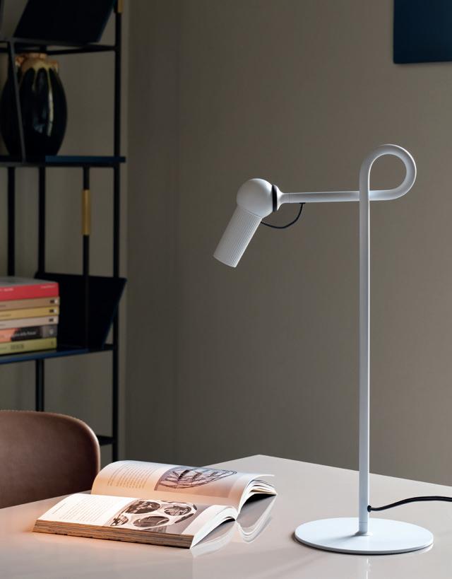 The curved top reinforces the lightweight, slim-line body while a magnet allows full rotation of the diffuser. The table lamp version of Bird has been enlarged to become a reading lamp.