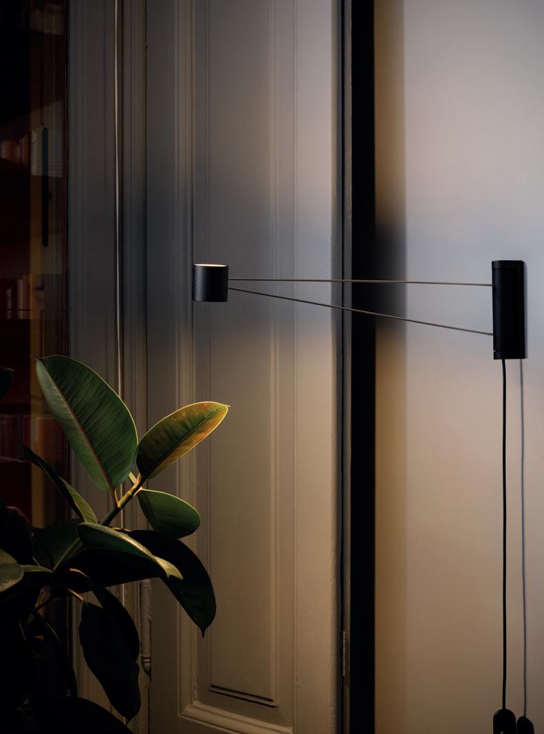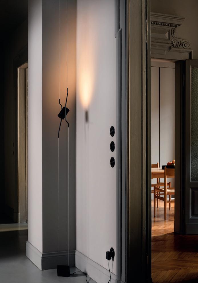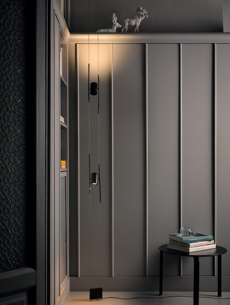 IT Due cavi tesi tra soffitto e pavimento definiscono un campo verticale dove il diffusore scorre, si ferma, si orienta. Nessun cavo aggiuntivo, la struttura è alimentazione. Tendu trasforma la tensione in libertà. Si posiziona dove serve, si orienta dove necessario, illumina con precisione.