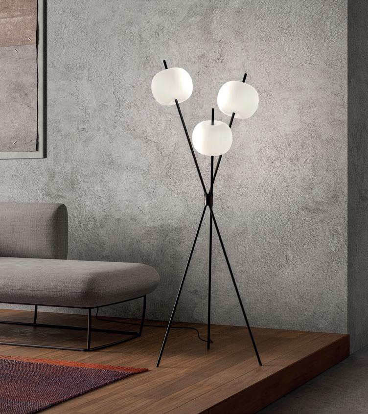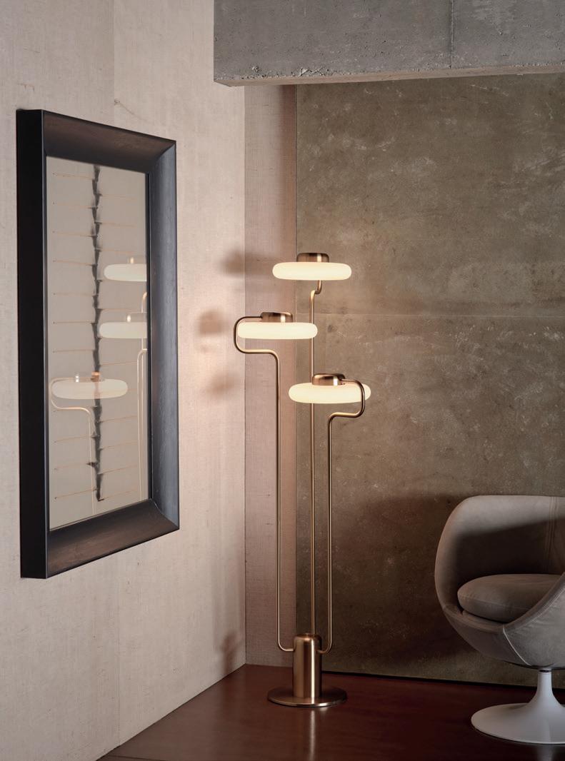 Dimmable floor lamp. Opal glass diffusers. Matte coated or brushed metal structure.