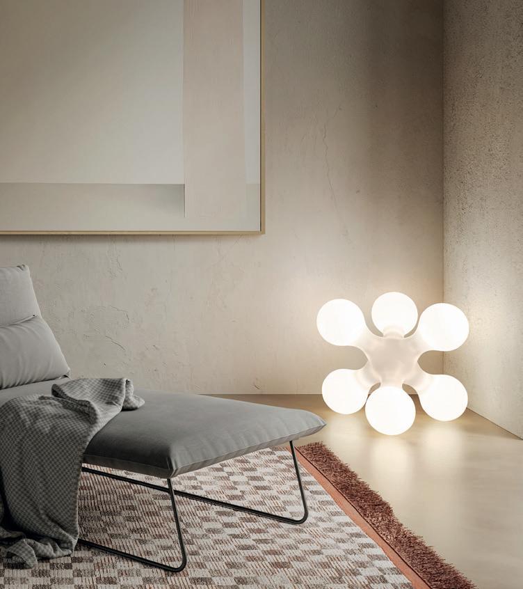 In Mars, light becomes the starting point of a composition where every shape finds its own dimension. A diffuser in balance, surrounded by volumes tracing trajectories through space. Tension and harmony coexist, gravity and lightness meet. Each volume responds to the other in an equilibrium that feels as though it has always existed. Mars Floor is a luminous sculpture where elements silently orbit, composing an order that reveals itself slowly; like the movement of a planetary system observing itself.