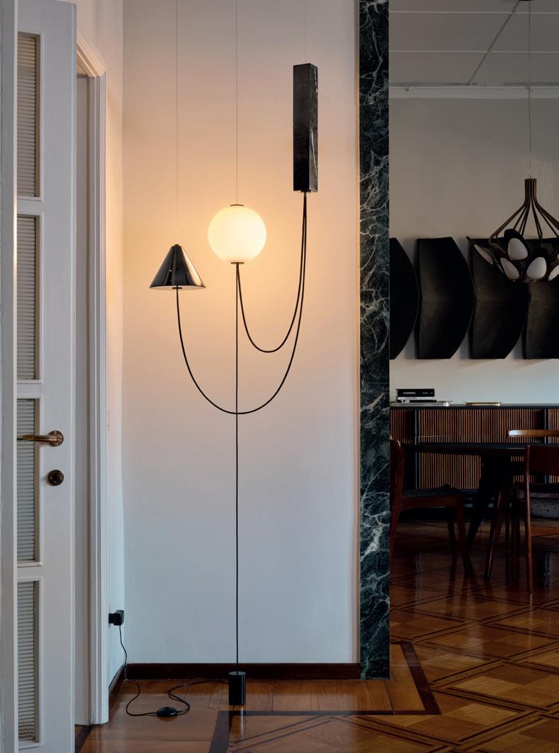 D Tratto Floor interpretiert die Pendelversion neu, kehrt sie um und projiziert sie mit skulpturalem Schwung nach oben. Ein Perspektivwechsel. Die verlängerte Silhouette verschmilzt harmonisch mit dem Raum und wird zu einem visuellen und sensorischen Bezugspunkt. Ein vertikales Zeichen, das mit Persönlichkeit leuchtet, mit dem Raum in Dialog tritt und neue Lichtbahnen zeichnet.