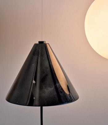 Lampadaire avec fixation au plafond. Diffuseur en verre opalin soufflé. Formes en marbre noir. Câble d’alimentation avec prise et variateur intégré.