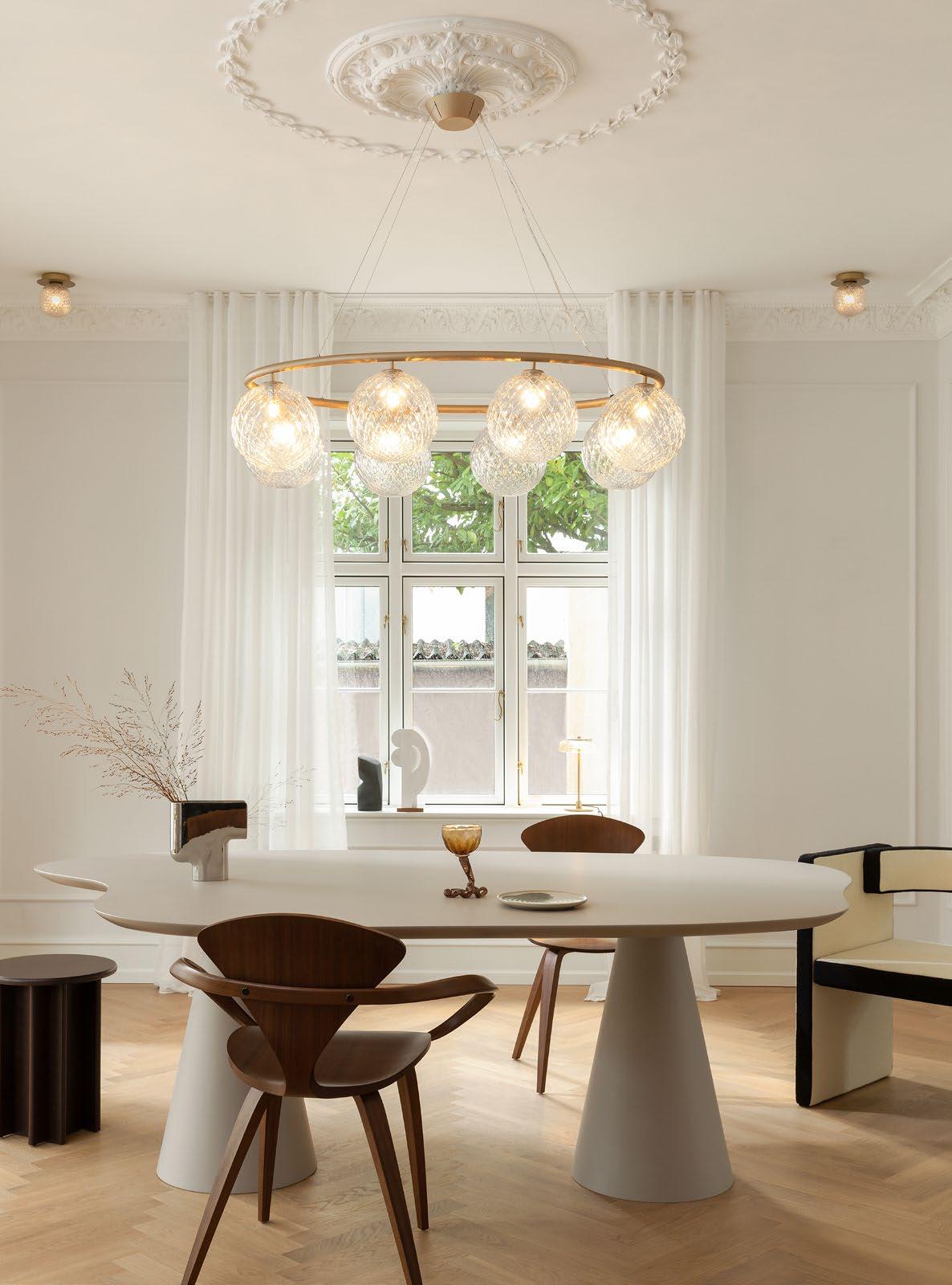 The Apiales collection draws inspiration from flowers and childhood memories. It includes single pendants, wall lamps, and chandeliers with 6, 9, or 18 mouth-blown glass globes. The chandelier’s arms unfold like flower stalks from a specially produced canopy. The collection is carefully crafted without visible screws or welds. With different sizes and variants, it is suitable for various uses in private homes and public spaces.